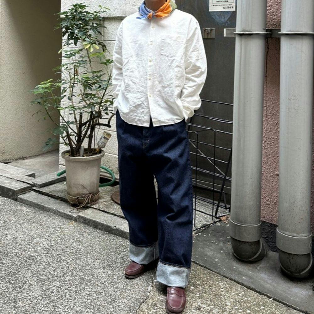 通常のフィットサイズとなるとデニムパンツ 藍(あい)はSサイズでピッタリですが、下半身に重さを持ってきたコーディネートに仕上げるため、あえて今回はLサイズをチョイスしました。ベルトでしっかりとウエストを絞めて着用しています。長袖シャツ 粋(すい)はフロントシルエットが短めなので下半身へ重心が行く様なスタイルでもバランスの良い見え方をしてくれます。また、顔まわりにバンダナやスカーフを用いることで、明るさやお洒落感もアップします。