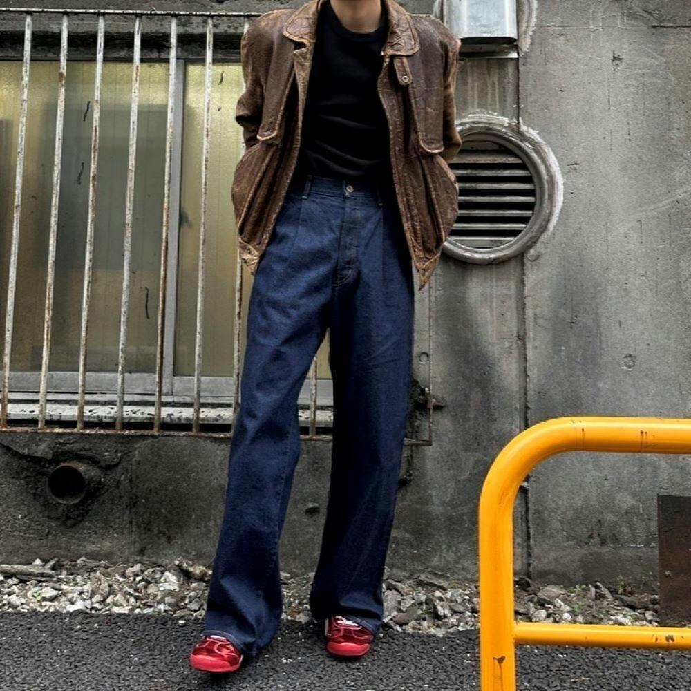 革ジャンとデニムパンツ 藍(あい)を組み合わせでアメカジコーデの完成です。シンプルな組み合わせなのにこなれ感とアメカジファッションの渋さにプラスの表現できる、まさに主役アイテムのデニムパンツ 藍(あい)。フロントボタンやリベット、ステッチのカラーなどにクラシカルなカラーを採用しているので、古着などのアイテムとの相性がいいです。細すぎずでも程よいワイド感が体系をカバーしてくれるので、スタイルアップデニムが欲しい方には是非オススメしたい一本です。