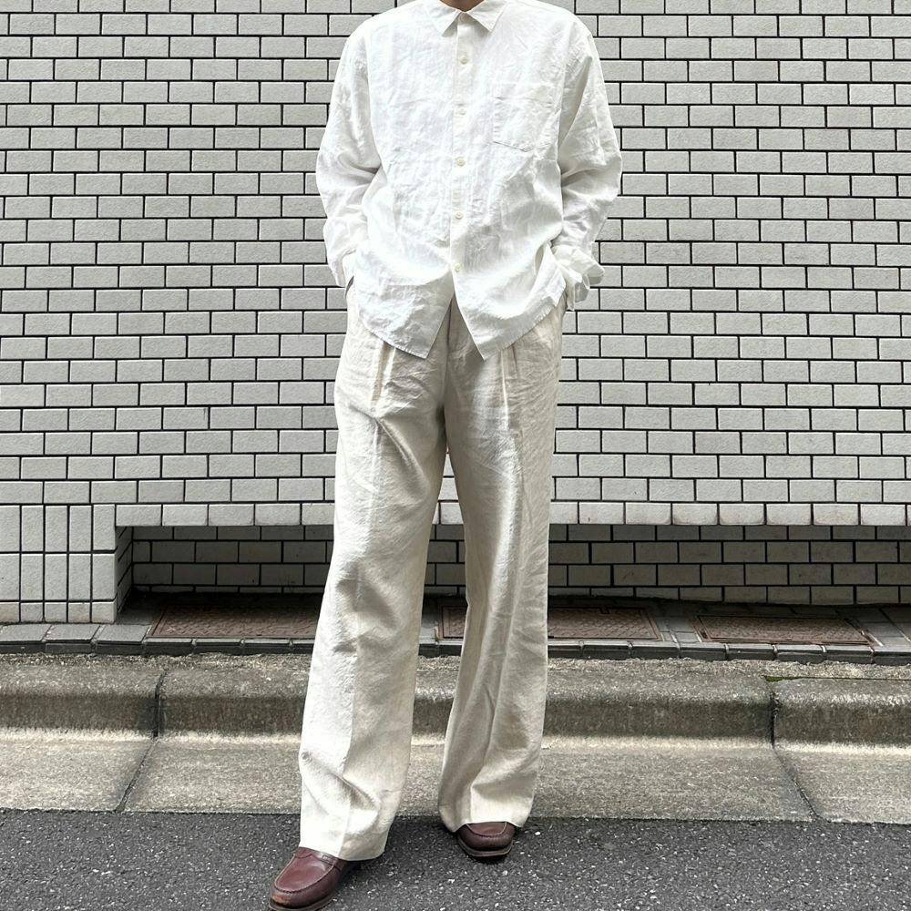 全身ECLECT(エクレクト)のアイテムでコーデを組んでみました。同系色で組む淡色コーデには、シルエットや素材感などどのようにまとめるか難しさを感じる部分がありますよね。ですが今回使用した 粋(すい)と 然(ぜん)の組み合わせであれば、ホワイトの長袖シャツにクリームがかったスラックスパンツで下半身にかけてグラデーションのカラーリングとなりグッとまとまり感がでます。かつ、スラックスパンツ 然(ぜん)は少し股下が長めな設計となっているため、スタイルアップ効果があります。また、アジャスターを使ってウエストの履く位置を調整いただくことで、ハイウエストであれば上品にローウエストであればルーズでラフなコーディネートをお楽しみいただけます。