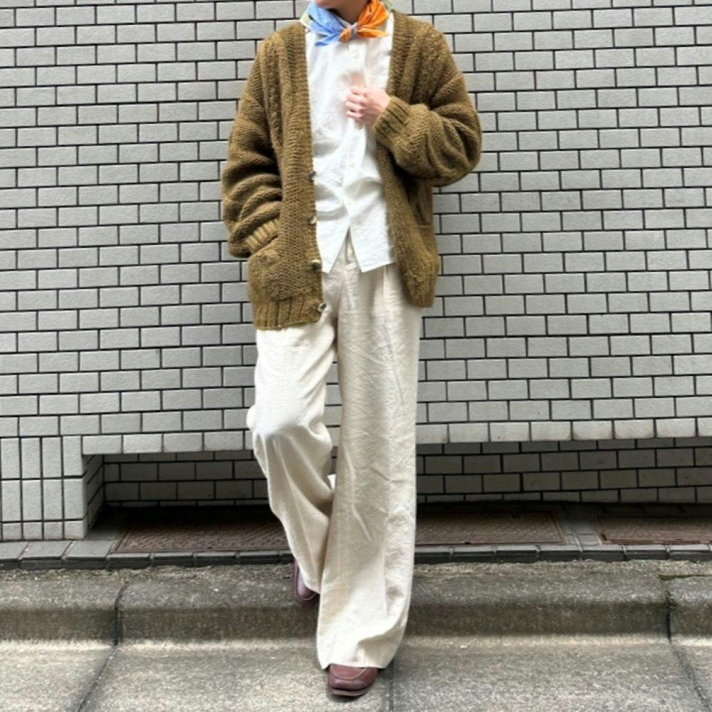 こちらのコーデもカーディガン以外はECLECT(エクレクト)のアイテムを使用してみました。少し優しめなカジュアルコーデに今回はしたかったので締め色としてカーディガンを羽織り、首元にはアクセントとしてオリジナルバンダナ 結(ゆい)をセーラー巻きにいました。こちらもブラウンやベージュなど同系色のコーディネートですが、オリジナルバンダナ 結(ゆい)のブルーが少し見えるような織り方に巻いてみたところもポイントです。使用しているバンダナも、コーディネートによって色合いを変えることが出来るのバンダナはなかなか無いため、とても使いやすいです。