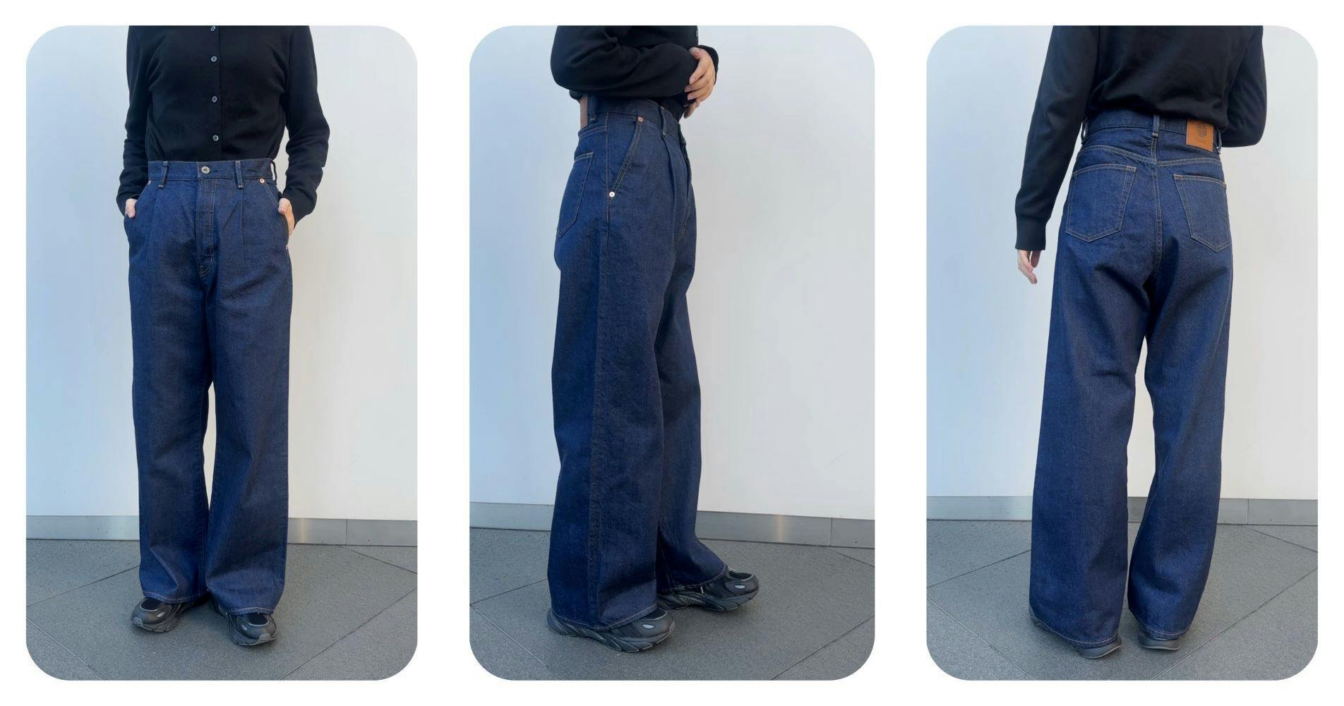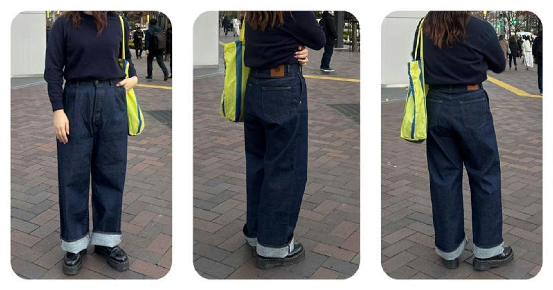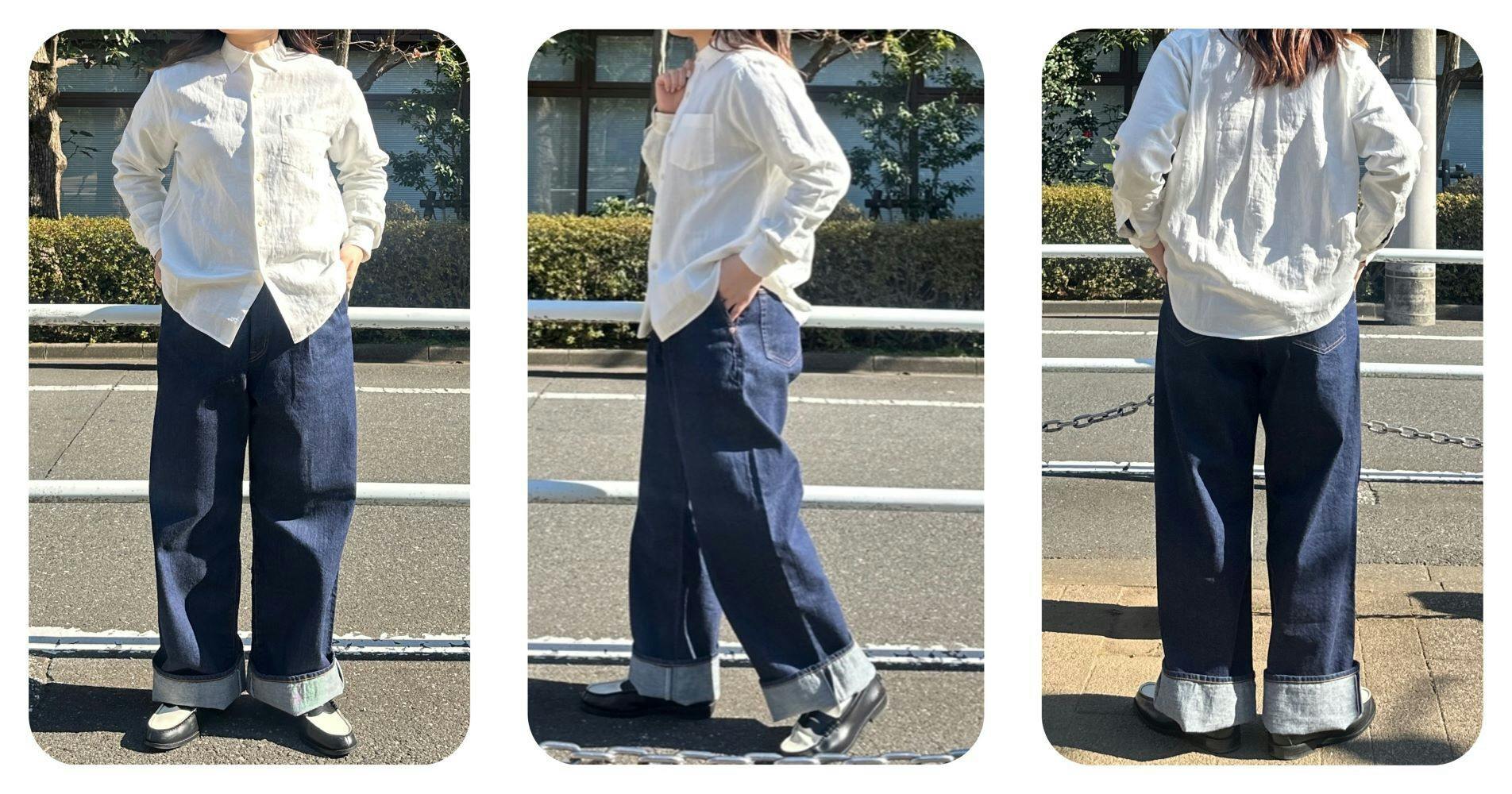 ロールアップ(1つ折り)で存在感のあるアイテムとして着こなしてみました!“デニムパンツ 藍(あい)”はワイドシルエットとなっている為、太ももあたりの着心地にストレスを与えません。
