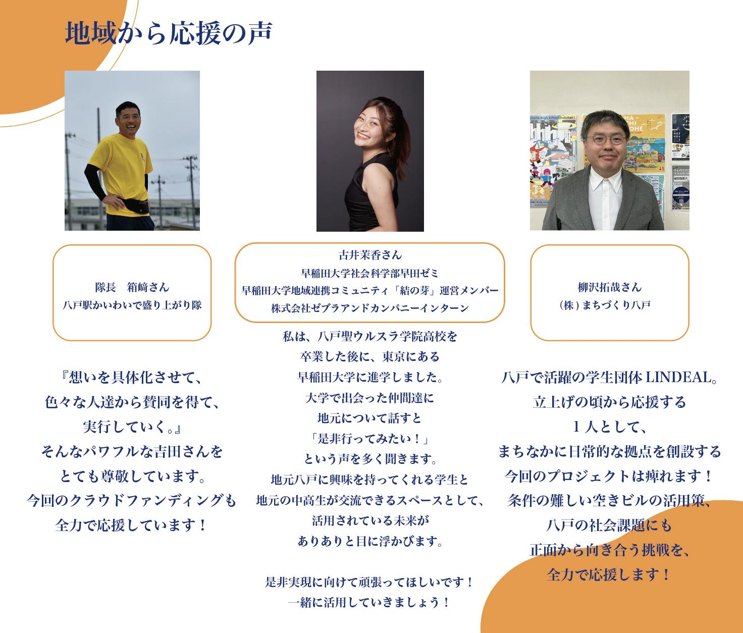 私たちは八戸の外の人間です。そんな余所者である私たちをいつも温かく迎え入れてくれる地域の皆様には感謝してもしきれません。だからこそ余所者にしかできないことを精一杯やるつもりです。よろしくお願いいたします。
