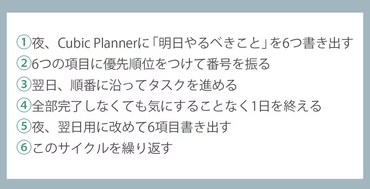 Cubic Plannerを効果的に使うためには、以下の手順を実践しましょう。まず、1日の終わりに翌日に完了すべき6つの重要なタスクをプランナーに書き出します。その後、タスクを重要度に応じて並べ替え、優先順位を決定します。翌日、タスクはその優先順位に従って一つずつ完了させ、現タスクが終わるまで次に進まないようにします。そして、1日の終わりには結果を振り返り、次の日のリストを作成します。このプロセスを繰り返すことで、効果的にタスク管理を行い、着実に成果を上げることができます。