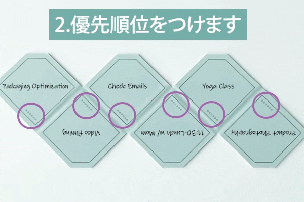 Cubic Plannerでは、タスクの優先順位を視覚的に管理することができます。各面の端には〇マークが配置されており、これを使ってタスクの優先度を簡単に示すことができます。タスクの重要度や締め切りに応じて、〇マークを塗りつぶすことで、優先度の高いものから順に視覚的に整理できます。これにより、どのタスクを先に行うべきかが一目で分かり、効率的に作業を進めることができます。