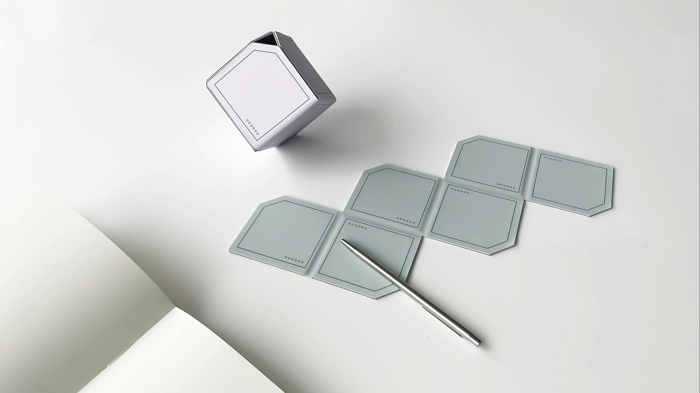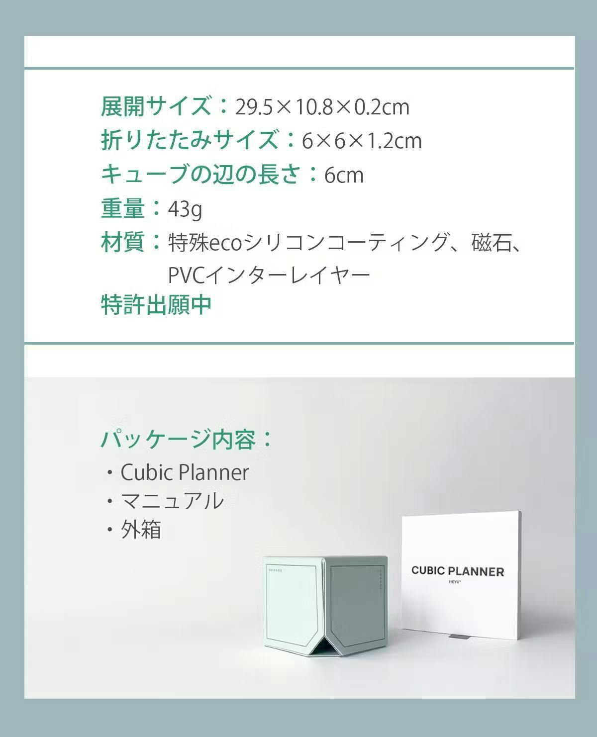 Cubic Plannerは、小型ながらも機能性に優れたデザインが特徴のアイテムです。展開サイズは29.5 x 10.8 x 0.2 cmで、折りたたみ後は6 x 6 x 1.2 cmとなり、キューブの辺の長さは6 cm、重量はわずか43gと非常に軽量で持ち運びにも便利です。素材には、特殊ecoシリコンコーティング、磁石、PVCインターレイヤーを使用しており、耐久性も高いです。パッケージには、Cubic Planner本体のほか、マニュアルと高品質な外箱が含まれています。