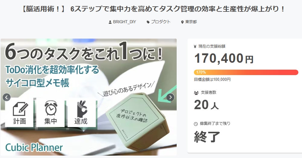 ご支援者様、【脳活用術!】 6ステップで集中力を高めてタスク管理の効率と生産性が爆上がり!にご興味をお持ちいただきありがとうございます。プロジェクト開始から30日目で20人ものご支援者の方々より支援頂き、無事プロジェクト終了を迎えることが出来ました。早速皆様のリターンを2025年03月末にお届けできるよう準備を始めております!皆様にご満足いただけるリターンをお届けできるよう、全力で取り組んで参りますので引き続き、「【脳活用術!】 6ステップで集中力を高めてタスク管理の効率と生産性が爆上がり!」をよろしくお願い致します。BRIGHTチーム