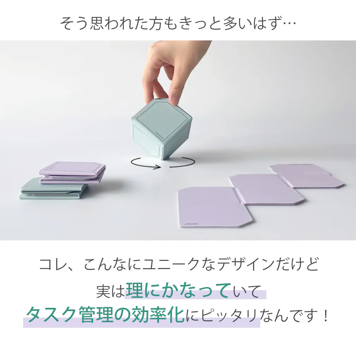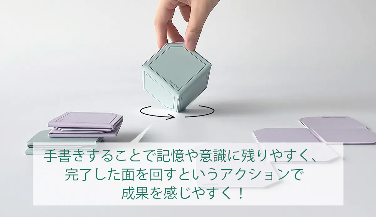 「書き出すタスクは6つのみ」というアイビー・リー・メソッドに基づき、Cubic Plannerは6面体のキュービックデザインになっています。だから、1回に見えるのは1つのタスクのみ。