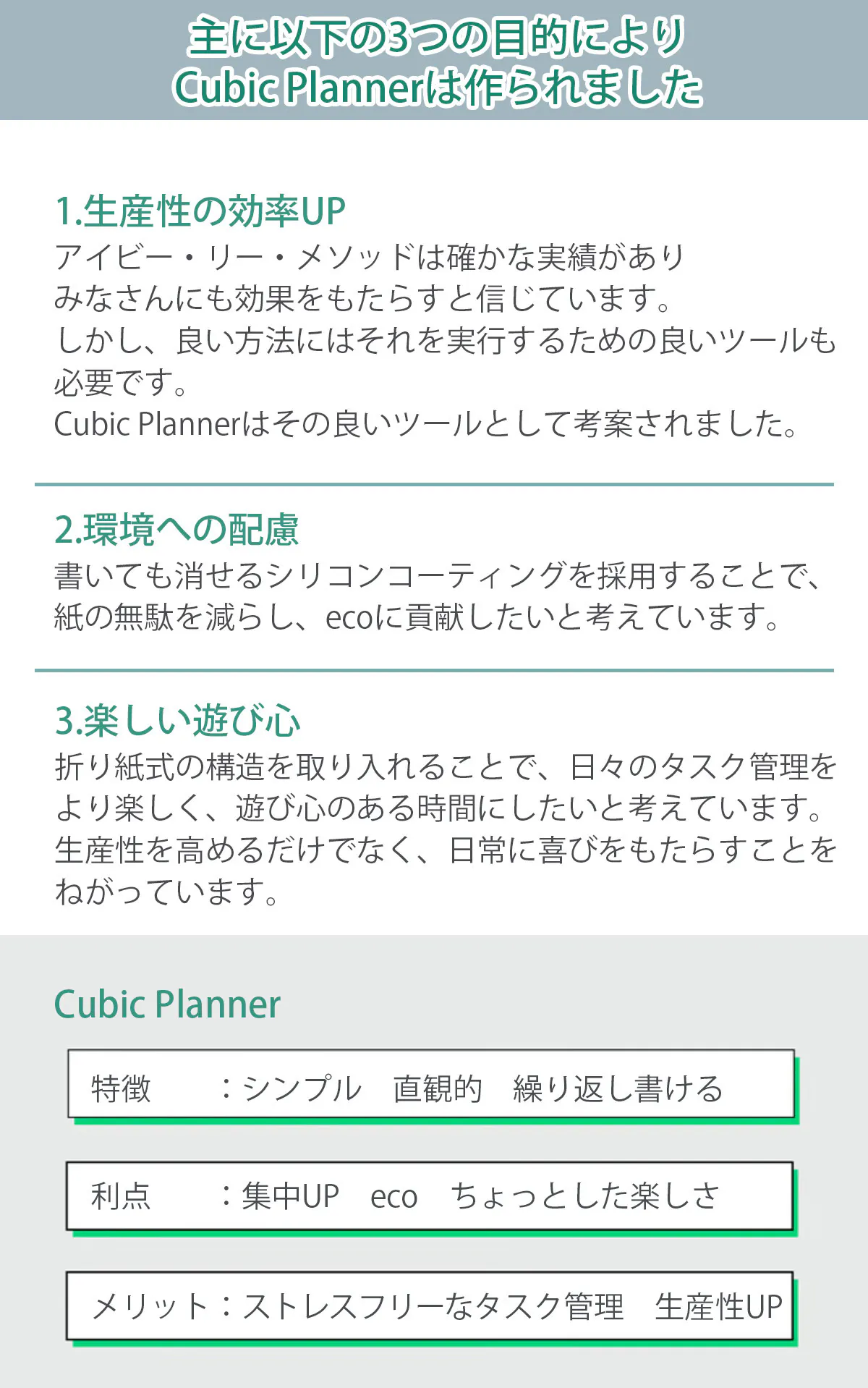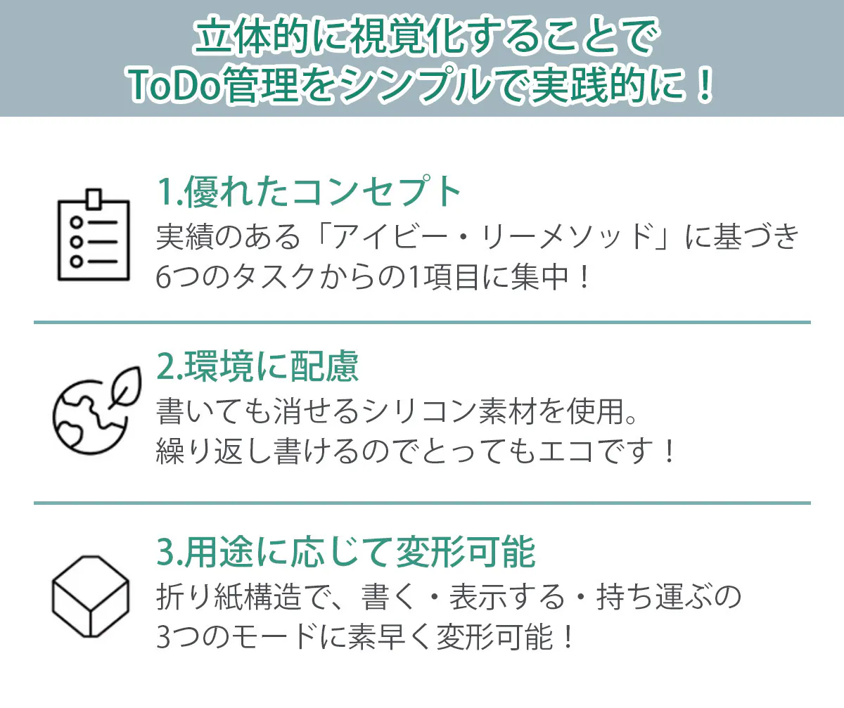 「Cubic Planner」は、アイビー・リー・メソッドを基にしたキュービック型のToDo管理アイテム。折り紙のように展開・組立て・折り畳みが可能でボールペンで何度でも繰り返し書けるツールです。遊び心のある見た目とは裏腹な、効率UPの効果と実績がしっかりある管理術です。皆さまのタスク消化におけるパフォーマンス向上を願ってこのツールを開発いたしました!