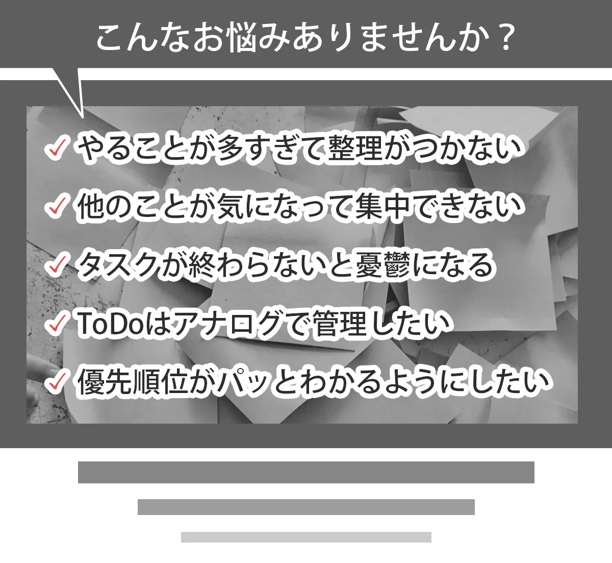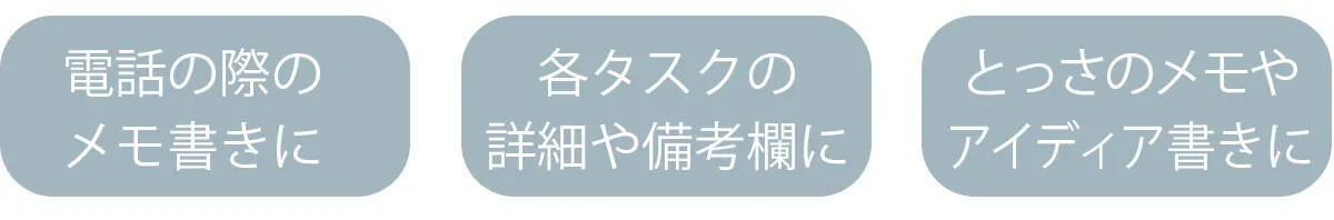 なんといってもそのシンプルさと簡単さがこのメソッドの特徴です。これにより「やるべきこと」「思考」の整理がつきやすく、作業にとりかかるまでの時間を大幅に減らし効率化へとつながります。