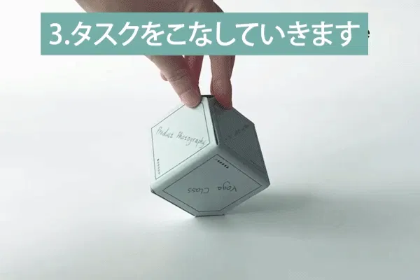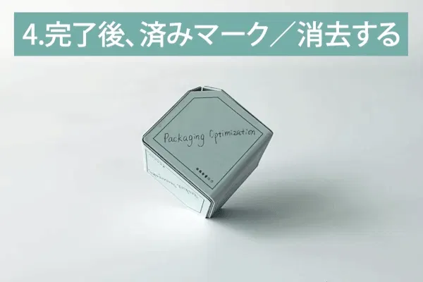 タスクが完了したら、消す/取り消し線を引くなどの完了済みのマークをつけて次のタスクの面に回転させます。
