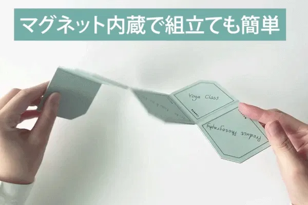 Cubic Plannerのユニークさは、折り紙に着想を得たそのデザイン。磁石による折り畳み式で、組立て・展開・重ねなど用途に応じて形状を簡単に変えることができます。