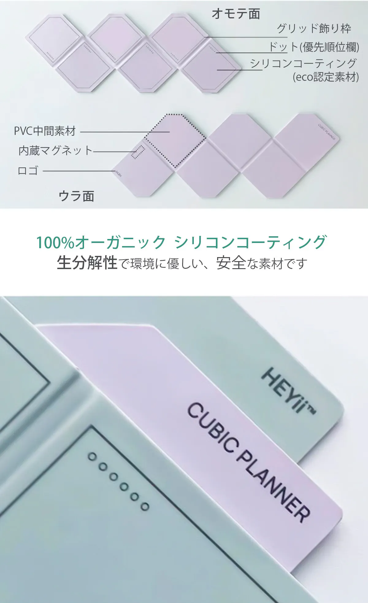 Cubic Planner は、単なるシリコン製品を超え、私たちの卓越性と細部へのこだわりが結晶化したものです。シリコン表面の特殊コーティングには通常のノートブック以上のコストがかかり、さらに高性能な素材を採用したことで、全体の製造コストが上昇しています。100%オーガニックシリコンの表面には合成素材の3倍のコストをかけ、長期的な安定性と耐久性を保証しています。それでもなお、品質を保ちつつ、適正価格でお届けするためのバランスを大切にしています。