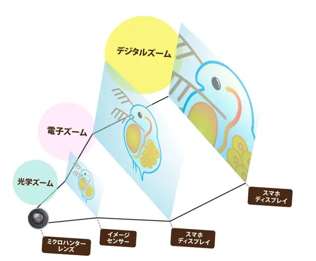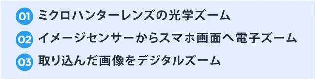対物レンズと接眼レンズを組み合わせた光学顕微鏡とは違い、ミクロハンターレンズは3段階の倍率を組み合わせて高倍率を実現しています。