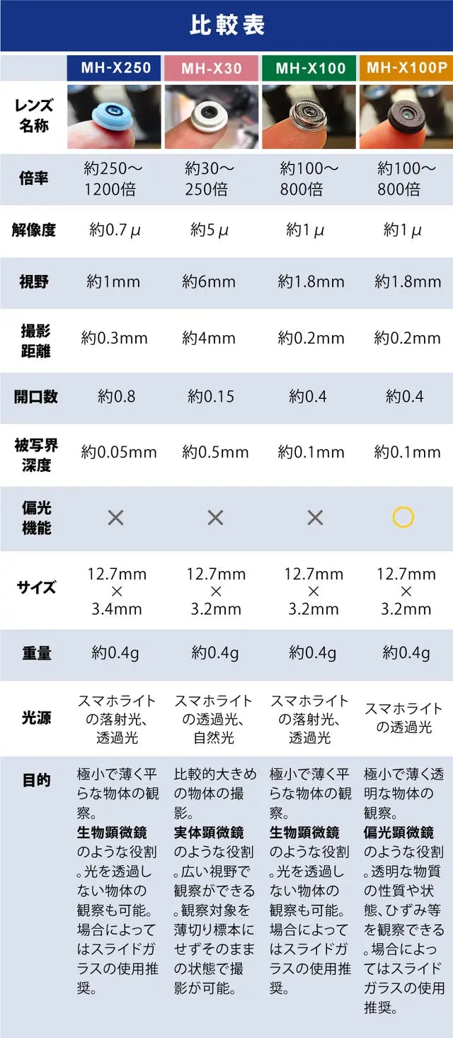 新たに加わったMH-X250はミクロハンターシリーズ史上、最高倍率のスマホ用光学顕微鏡レンズになります。
