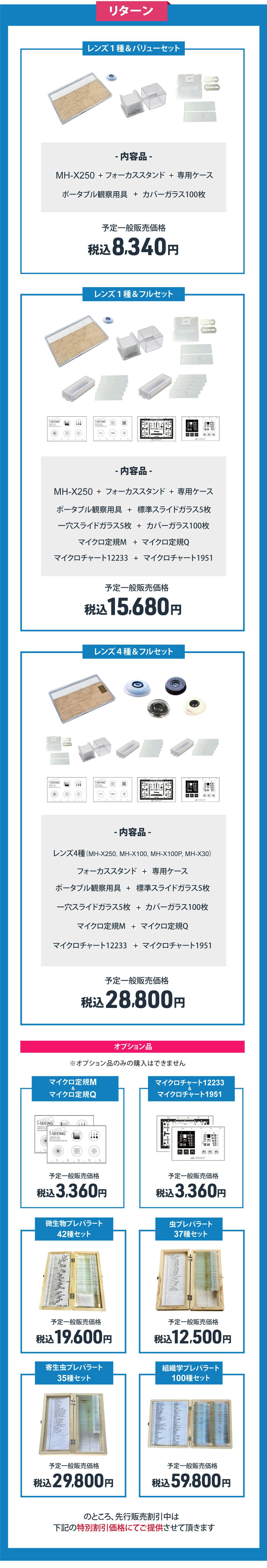 2025/02/04 19:30\新レンズMH-X250の一般販売開始!/大変お待たせしました!ミクロハンターレンズ史上、最大倍率を誇るMH-X250のキット「ミクロハンターキットX250」の一般販売を開始しました。一般販売についてたくさんのお問い合わせを頂いておりましたが、開始までお時間がかかってしまった事、申し訳ございません!このレンズMH-X250はスマホ機能と合わせて250~1200倍での観察が可能で、生物や植物の組織、微生物を観察するのに向いています。これまでのレンズでは観察できなかったミクロ世界を探索する事ができますので、ぜひ色々と観察してみてください。公式ショップにてご購入可能です。https://microhunter.shop/products/kit-x250※現在の在庫が売り切れた場合は、入荷にお時間頂く場合もございます。 もっと見る【お知らせ】すべてのリターンの発送が完了しました