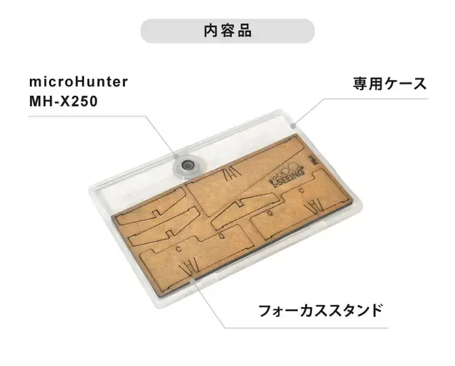 またカードサイズの専用ケースには複数のミクロハンターレンズ、マイクロ定規、フォーカススタンドを収納でき、財布に収納可能です。