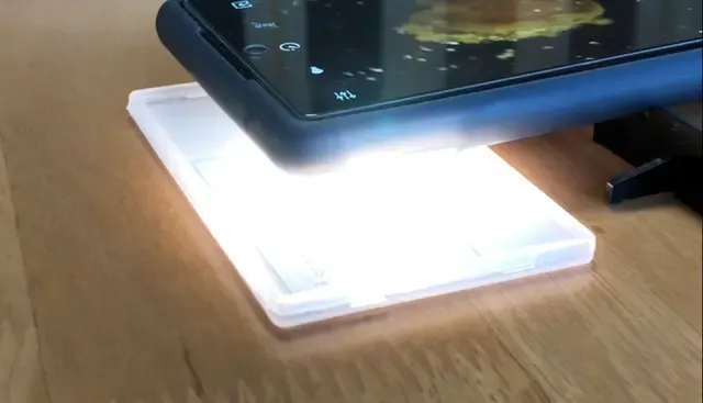 専用ケースも照明ボックスとして役立ちます。スマホライトや周囲光は、サンプルを直接照らすだけでなく、ケースの底面からの反射光もサンプルを照らします。