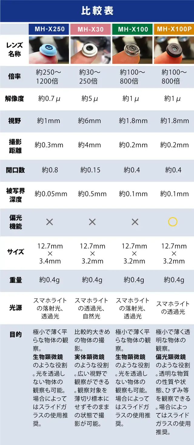 ミクロハンターレンズは今回の新製品も含め全4種類あります。それぞれの違いについては以下の表をご参照ください。