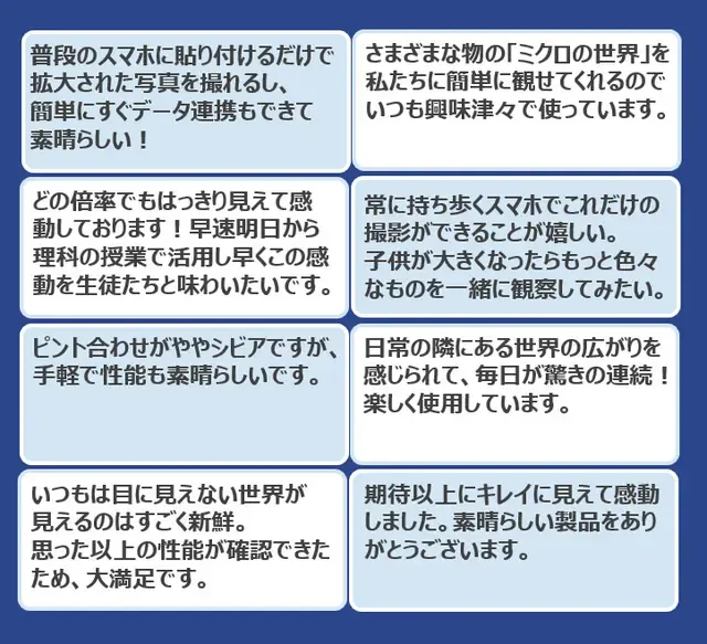 「スマホ用のレンズは数々ありますが、像品質は群を抜いているように見えます。珪藻を撮影しているので筆者には性能が一目でわかります。像品質もよく、球面収差は小さめです。顕微鏡を使わずにスマホにレンズ一個つけただけでということを考えると、この画質と解像はほとんど”驚異的”といってよろしいかと思います。」