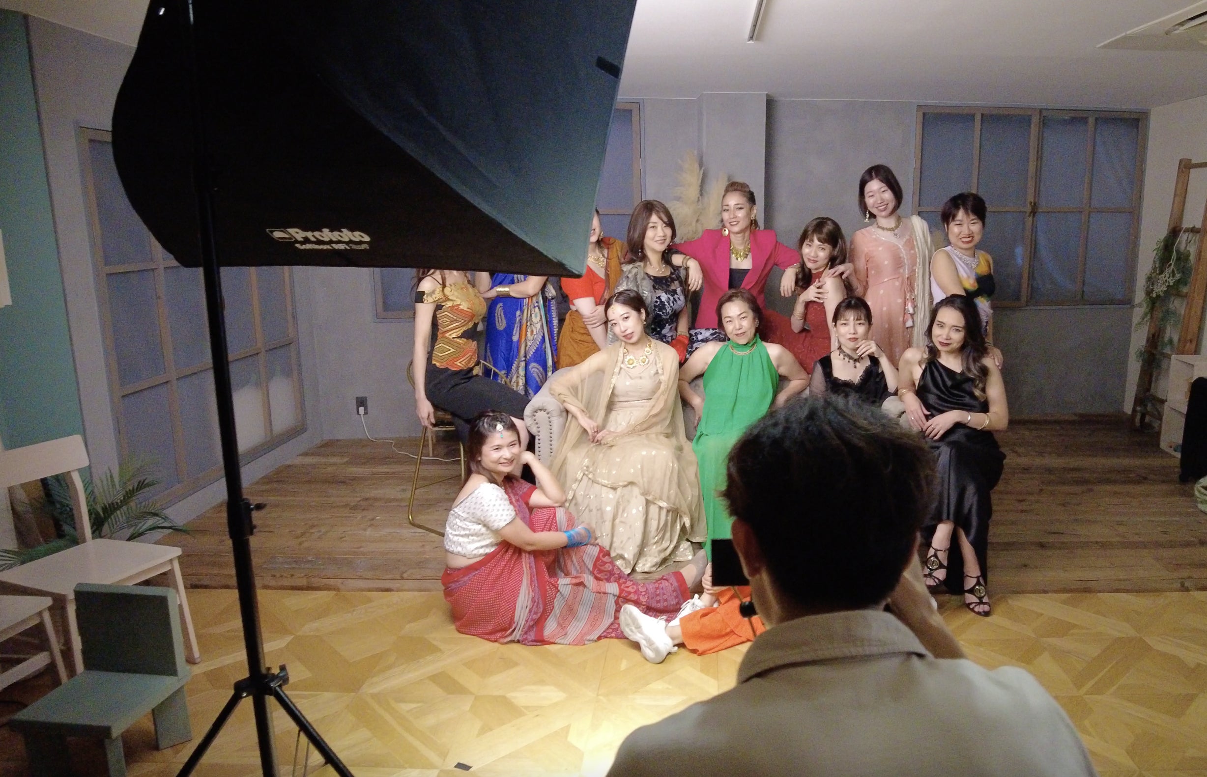 テーマはレッドカーペット!パーティドレスやインド伝統服「サリー」を纏い、まるでスターになったような気分で撮影しました。煌めく笑顔と情熱が詰まったページで、あなたもボリウッドの世界へ!