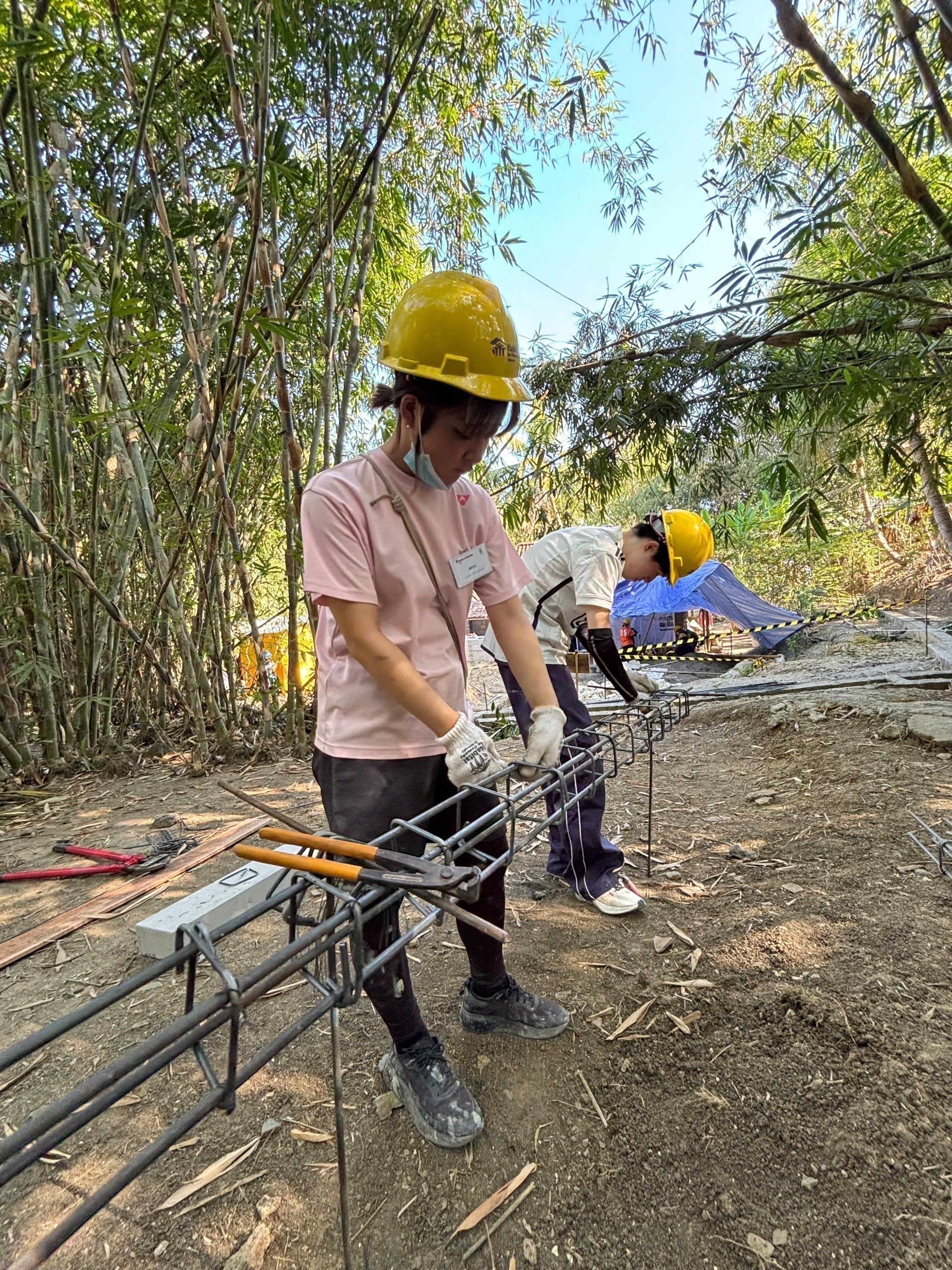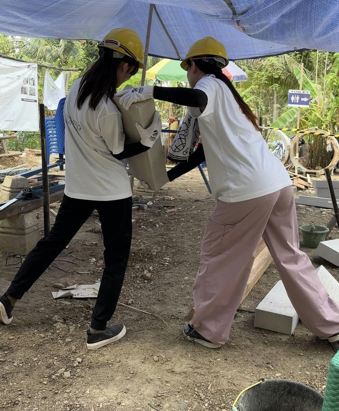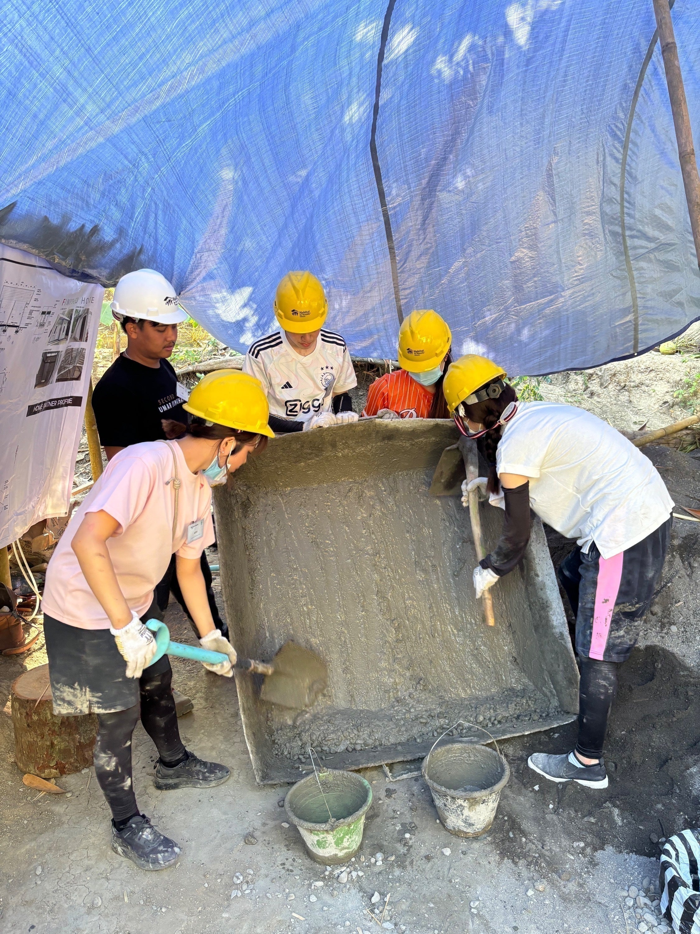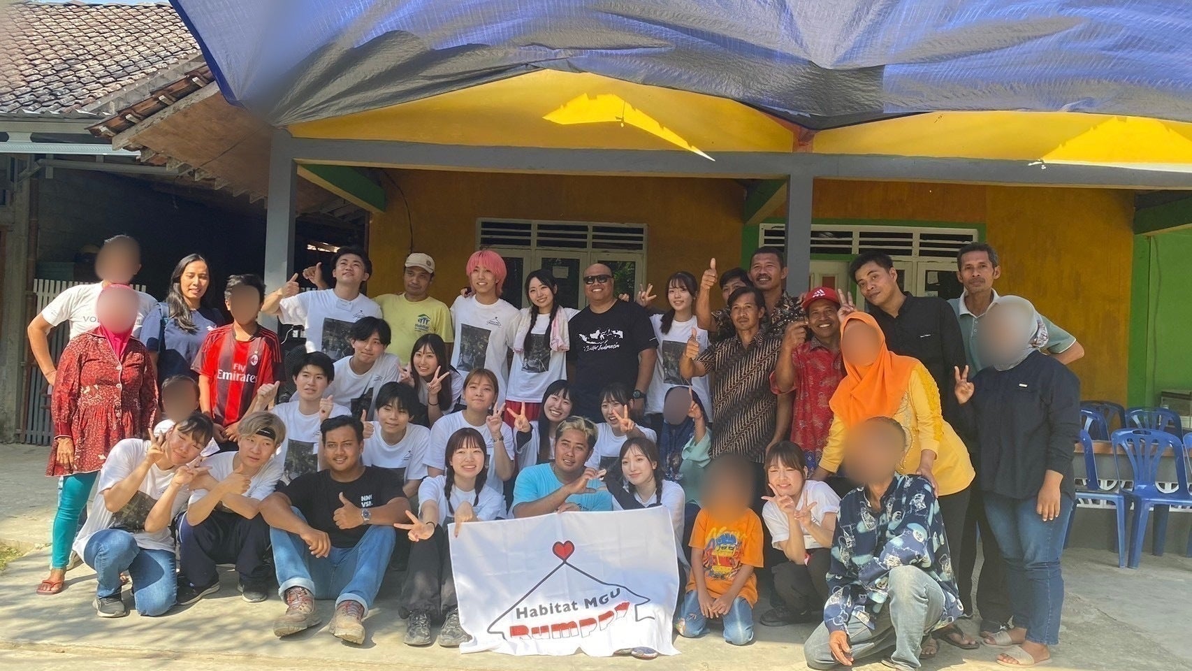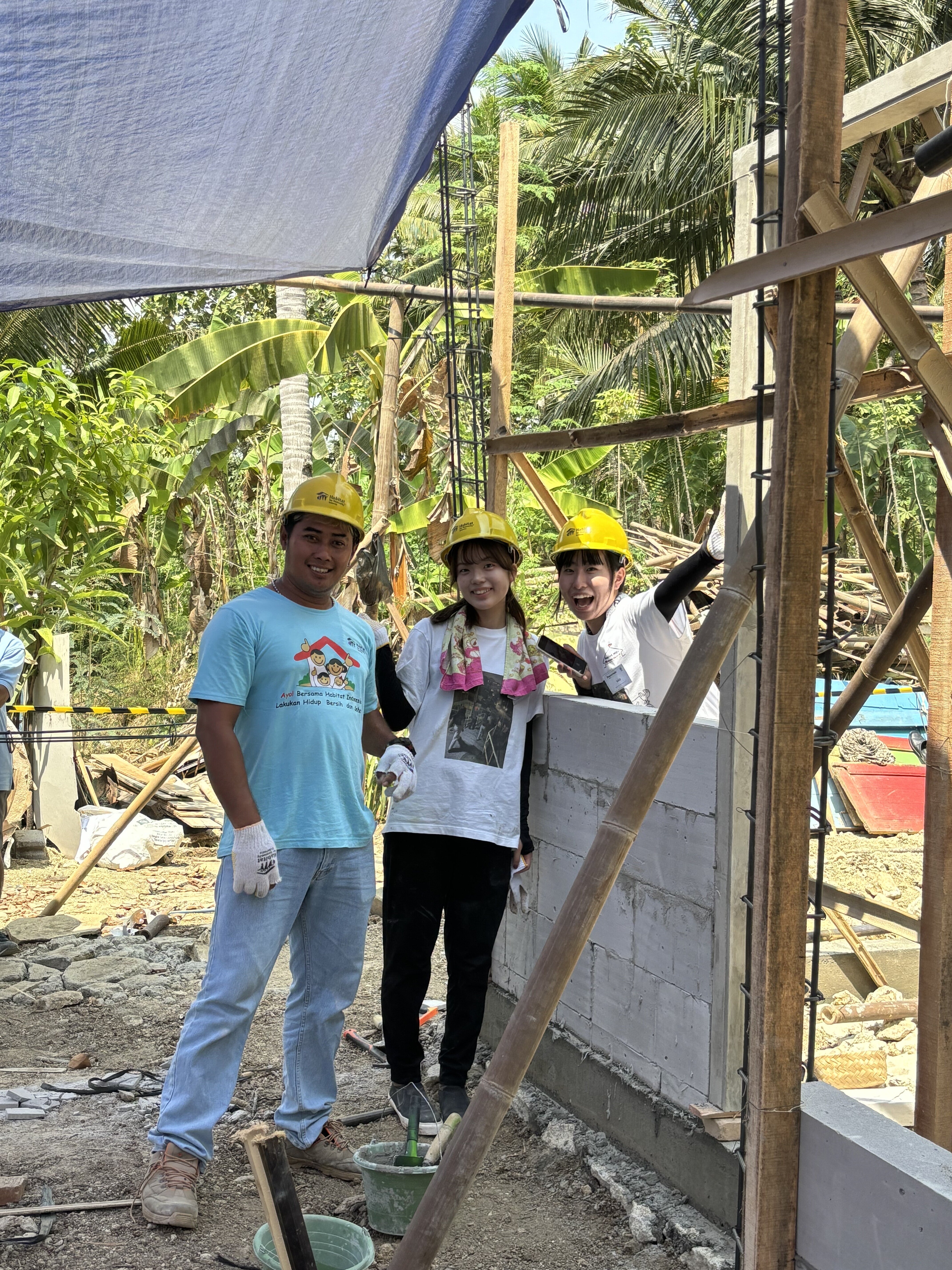 私たちは2024年8月にインドネシアのジョグジャカルタでボランティアに参加し、家の柱や外壁の施工に携わりました。何もない土地を掘って、柱を立て、セメントを流し込みブロックを積むという工程を行いました。セメントを一から作ったり、ワイヤーを手作業で組んだりととても過酷な作業でした。ホームオーナーになる方とも共同で作業し、休憩時間にはお互いの暮らしについて話し合ったりもしました。帰国する際には現地のスタッフさんとホームオーナーさんが涙ながらに感謝してくださり、別れを惜しむ姿にとても感動し、やりがいを感じました。