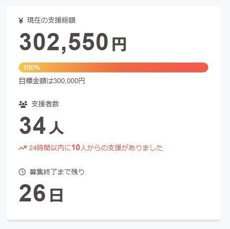 34人のご支援者様はもちろん、お気に入り登録、SNSでのシェア、ご友人への紹介などの形でご協力いただいたすべての皆様の力が集まったことにより、目標に到達することができました。心より感謝申し上げます。