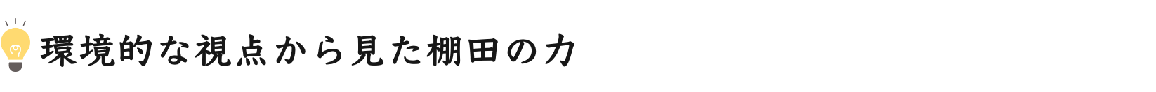 カエルの鳴き声、トンボの舞う姿、草の中を駆ける虫たち。棚田では、たくさんの生きものたちが共に暮らしています。人と自然の共生が、そこには確かにあります。- 地球の未来を守る小さな一歩
