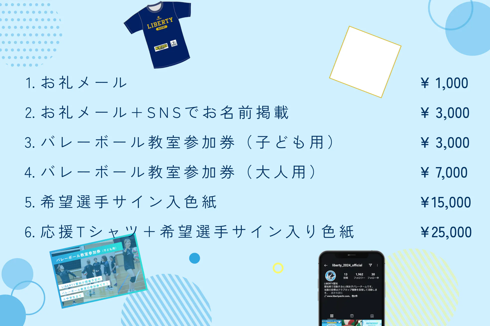 チームオリジナルグッズや、バレーボール教室への優先参加権など、バレーボールの魅力を感じられるリターンをご用意しています。