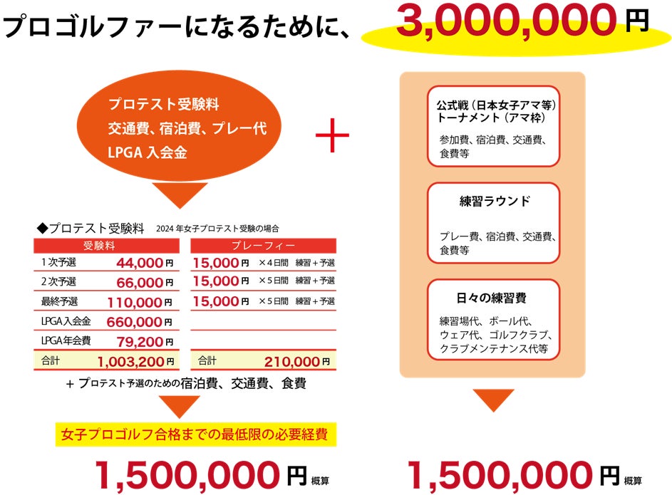 例えば、女子プロゴルフテストを受験するに当り、3次テストまでの受験料、受験のラウンド費、宿泊交通費、練習ラウンド費等で最低でも300万円以上かかると言われていいます。