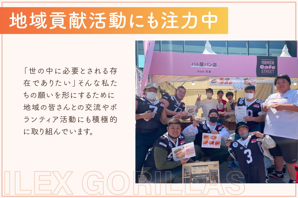 取り組みで触れ合った方達に、アメリカンフットボールというスポーツ、そして選手のことも“面白い近所のお兄ちゃん”のように身近に感じてもらいたいと思っています。こういった活動を年に数回行うチームは他にもありますが、私たちは年間を通じて定期的に行っています!アメフトを通じて、世の中の皆さんに元気や笑顔を届けられるのが、私たちの何よりの喜びです!