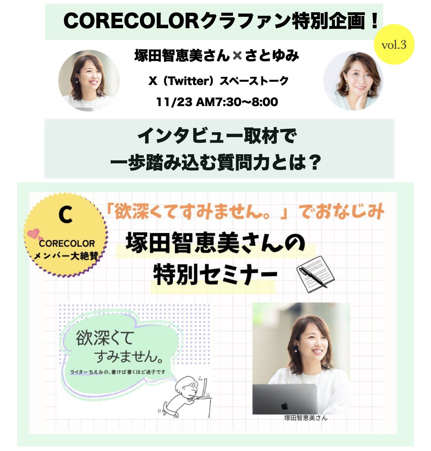 今日は、たくさんのご支援に対するお礼の気持ちもこめて、クラウドファンディング特別企画vol.3、ライターの塚田智恵美さんに「インタビュー取材で一歩踏み込む質問力とは」の内容でプレトークをしていただきます。
