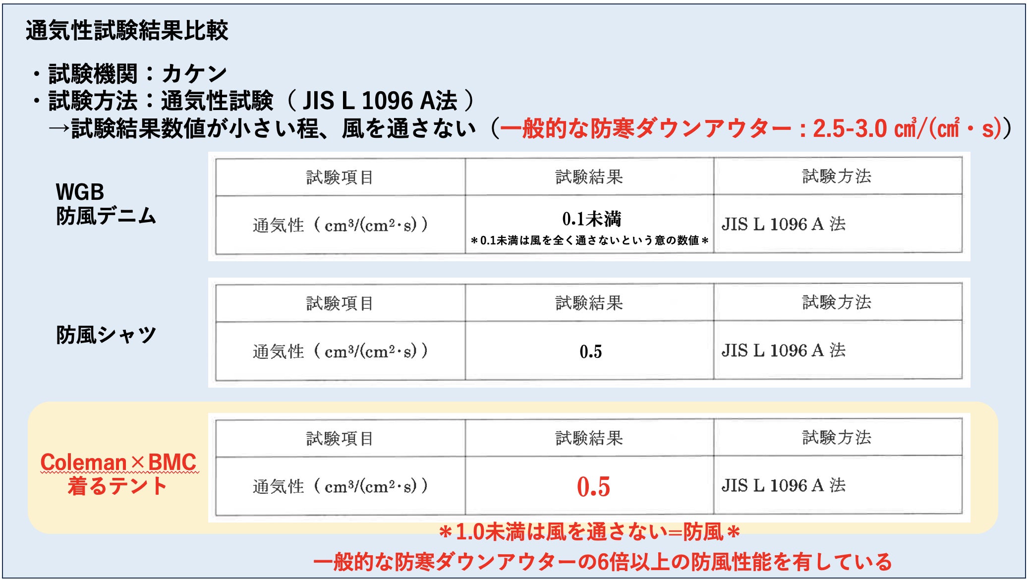 表地での通気性試験結果です。風、通しません!そして、【着るテント】は三層構造になっています。中綿がありフリースがあります。層になり厚みもあるので、更に風を通さないのは容易に想像つくかと思います。冬の厳しい寒風の侵入をガチで防ぎます!
