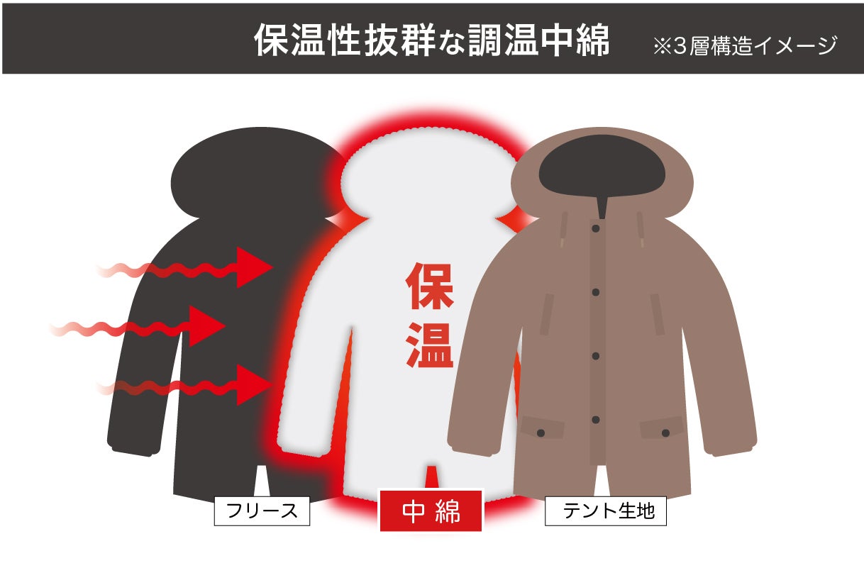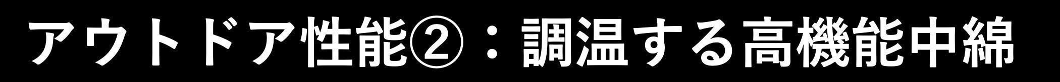 【着るテント】に入っているのは調温し保温する中綿です!高機能な調温高分子多孔綿を用いてます。簡潔に言うと・・・軽くて、衝撃に強く、空気の層を作りやすく、衣類の熱を溜め込む事ができる綿です・・・保温性抜群で且つ衣類の中を最適な暖かさにしてくれる綿が入っています。