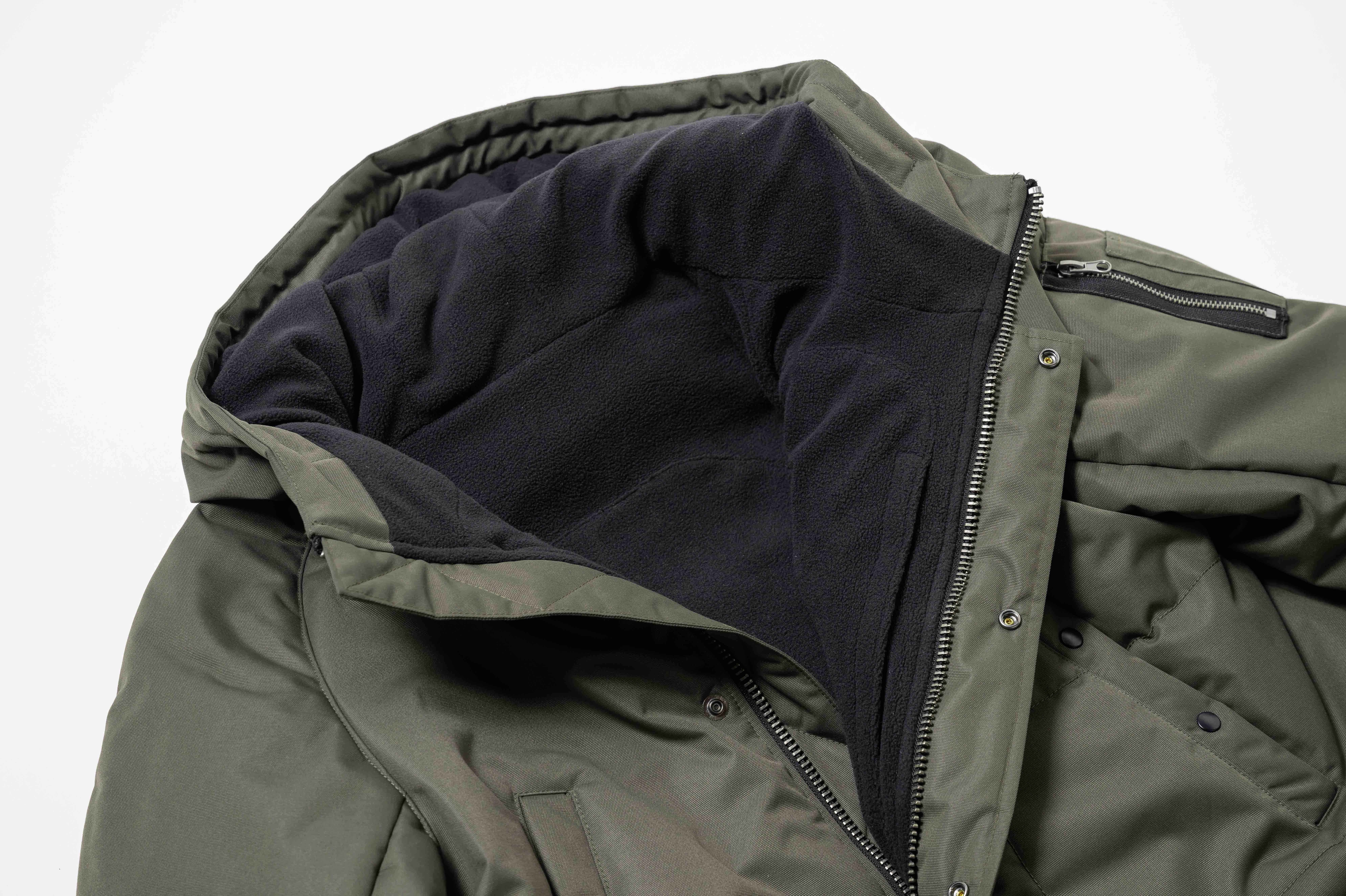 今回テント素材ベースとして衣料用素材に落とし込みを行いました。表面は軽度な撥水性と防風コーティングを施した特殊な素材、調温機能がある高機能中綿、そして保温性のあるフリースのトリプルコンボな三層構造素材を用いています。
