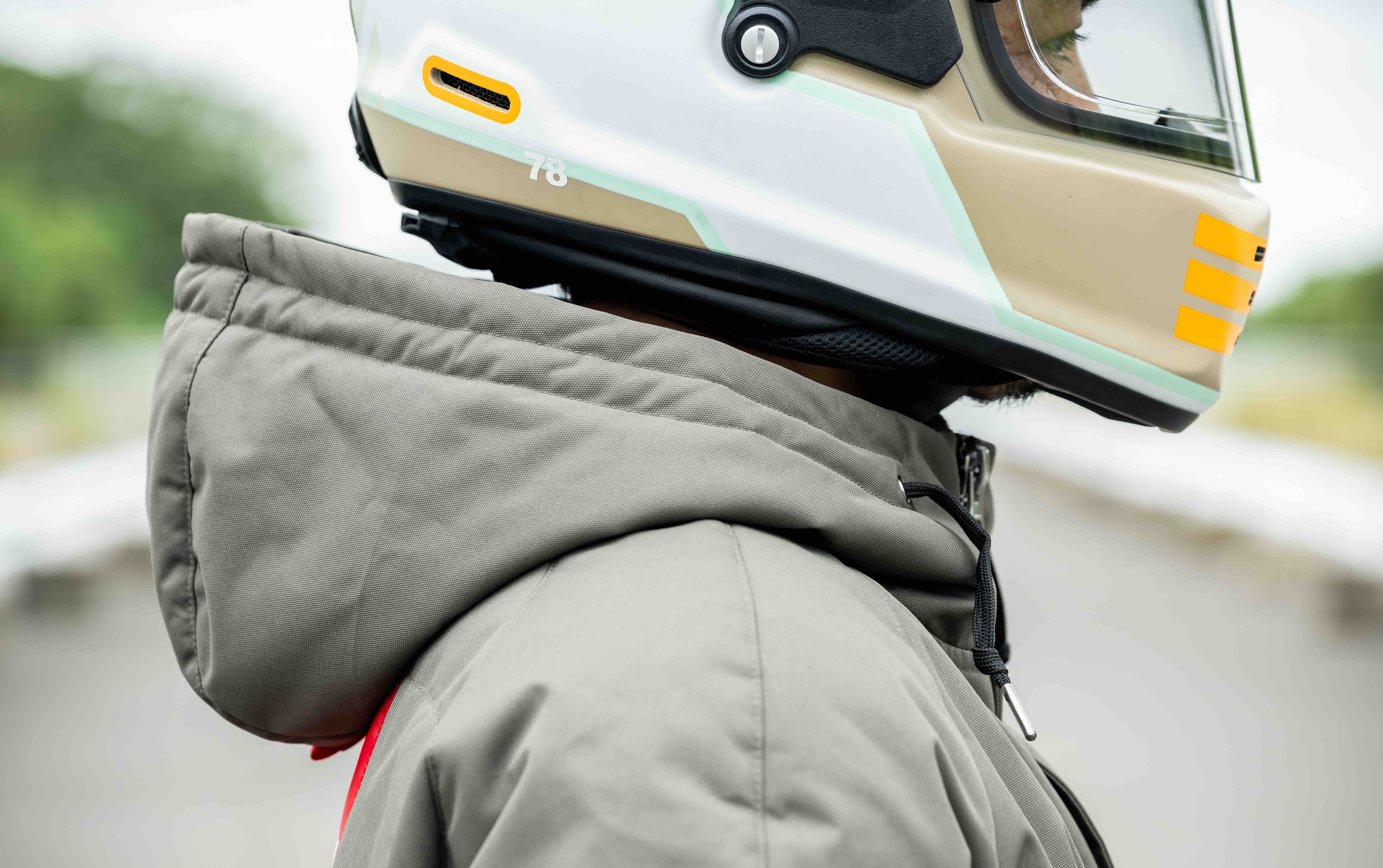 はい!ドーーーン!!!【着るテント】の襟はヘルメットに干渉しないんですよ!ちゃんとバイク用として考えております。