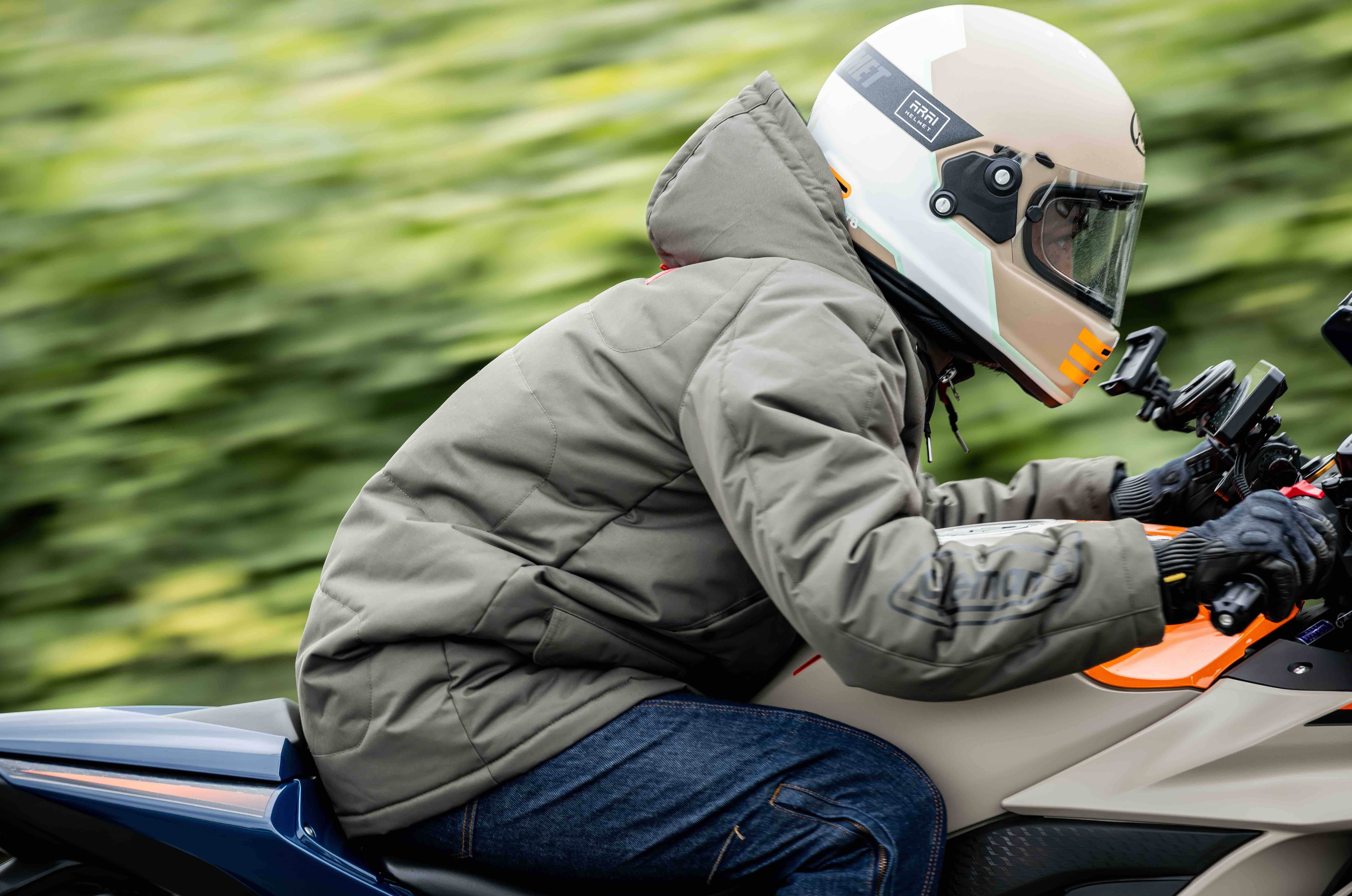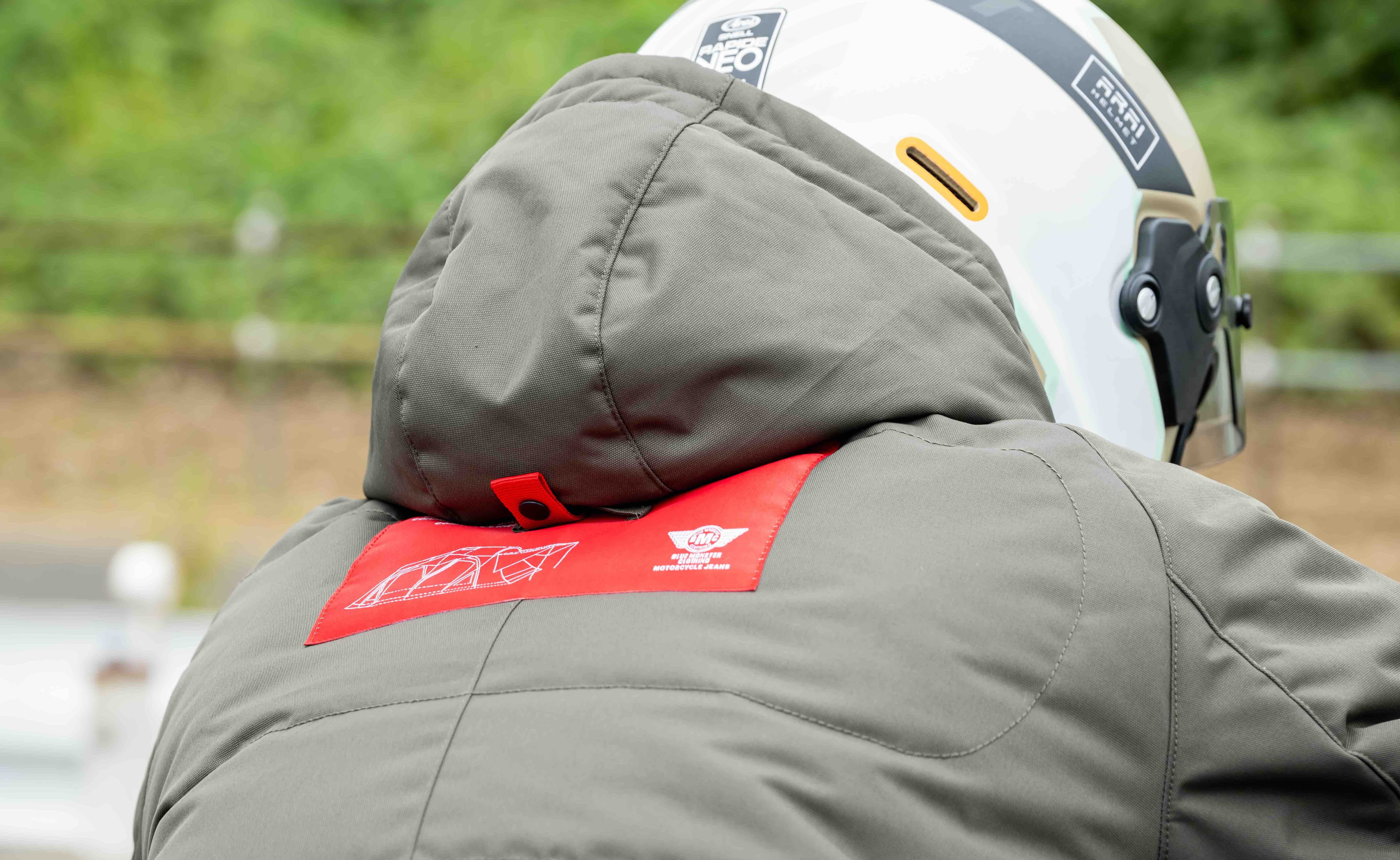 走行風でバタつくフードですが、背中でしっかりストッパーで固定できます。高速道路でも走行試験を行なっていますが時速100キロでもフードのバタつきは気にならないですよ。