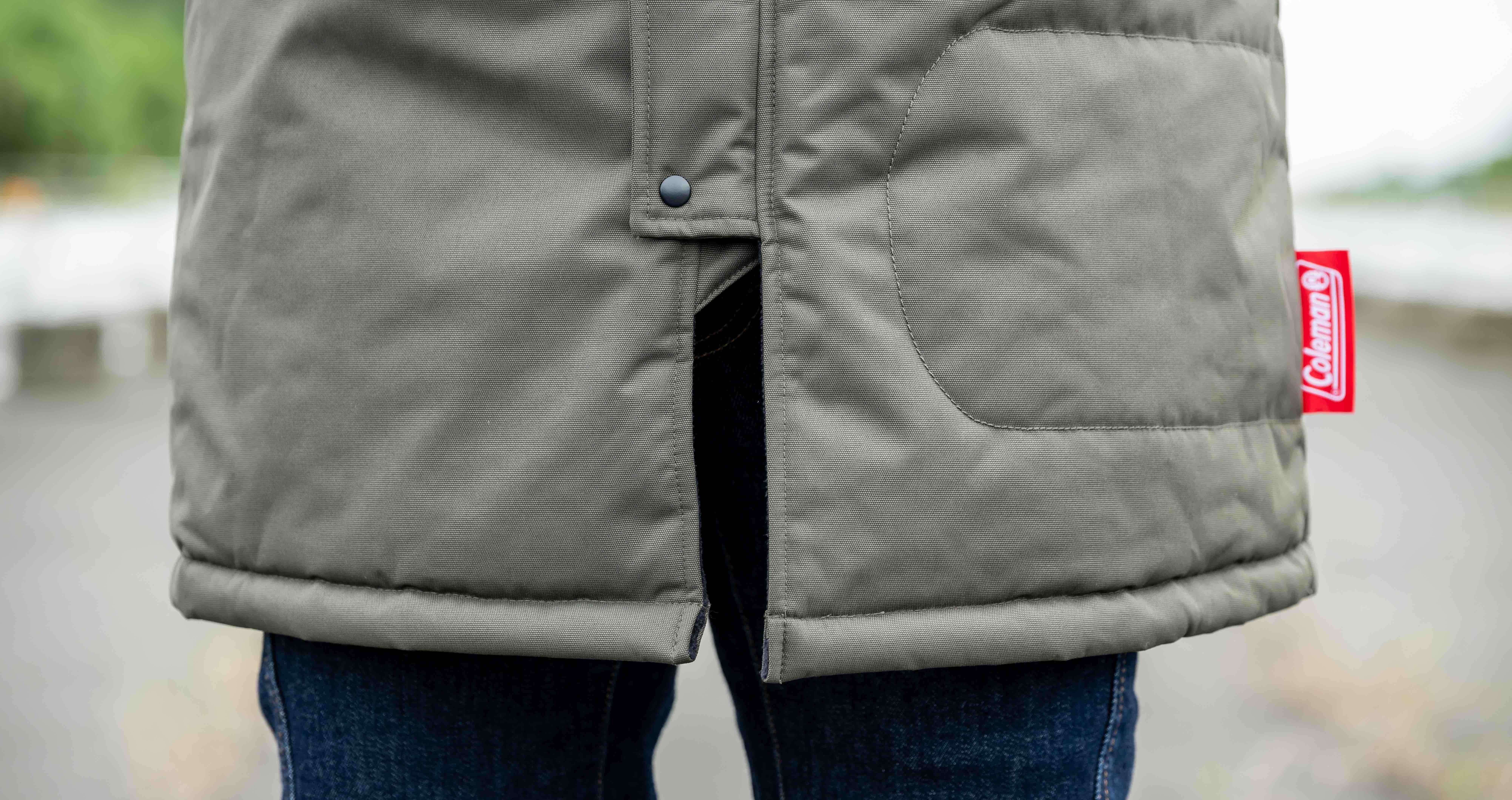 この裾・・・割れてます。割れ裾です(笑)ここがカジュアルやアウトドアのアウターと見た目で差別化されている仕様になります!オートバイ専用設計の秘密兵器です!