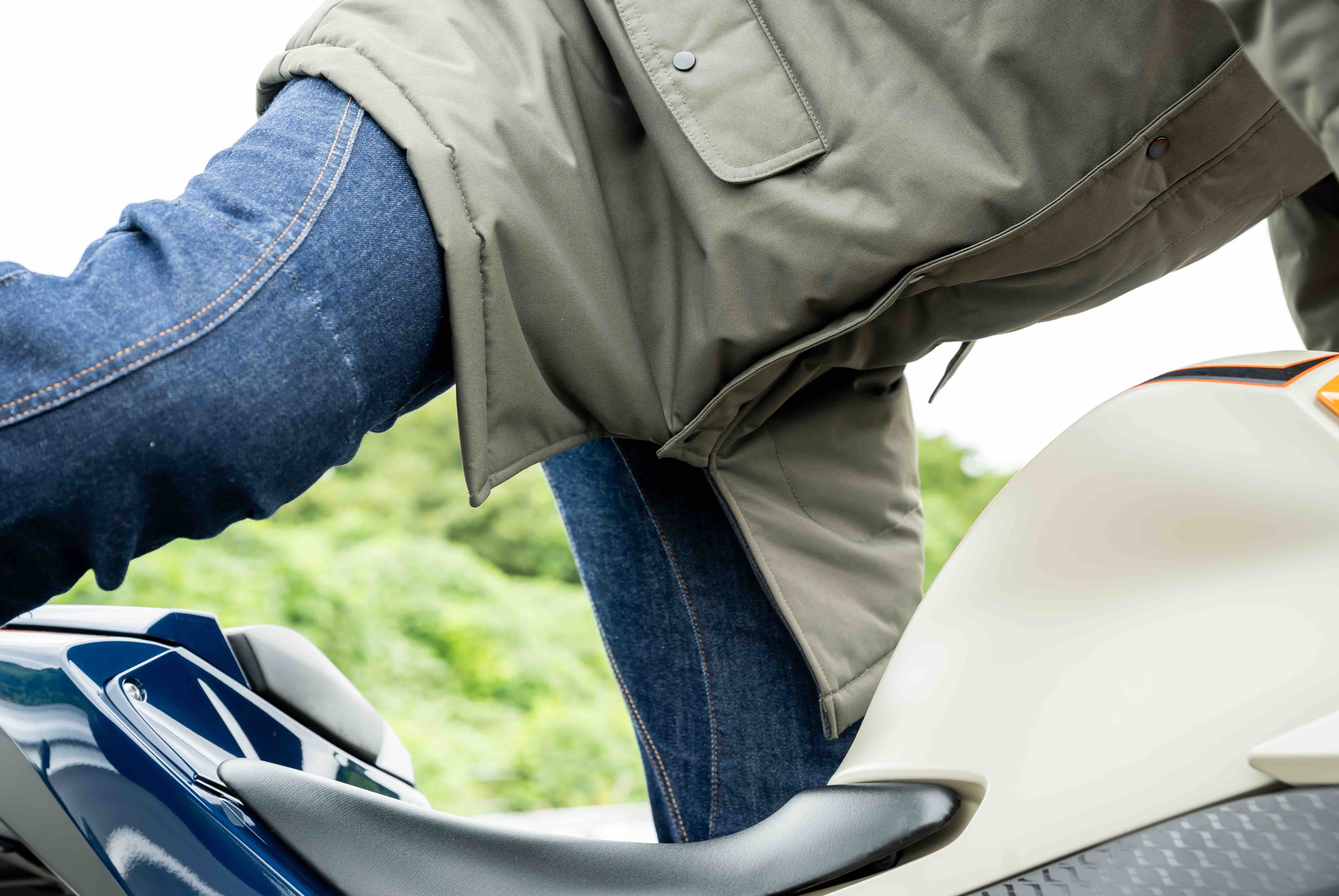 カジュアルのミドル丈アウターでバイクに乗ると裾が邪魔で邪魔で仕方ないですよね!バイクに跨る。乗車姿勢。あらゆるバイクに関わる行動において、裾が邪魔です(笑)