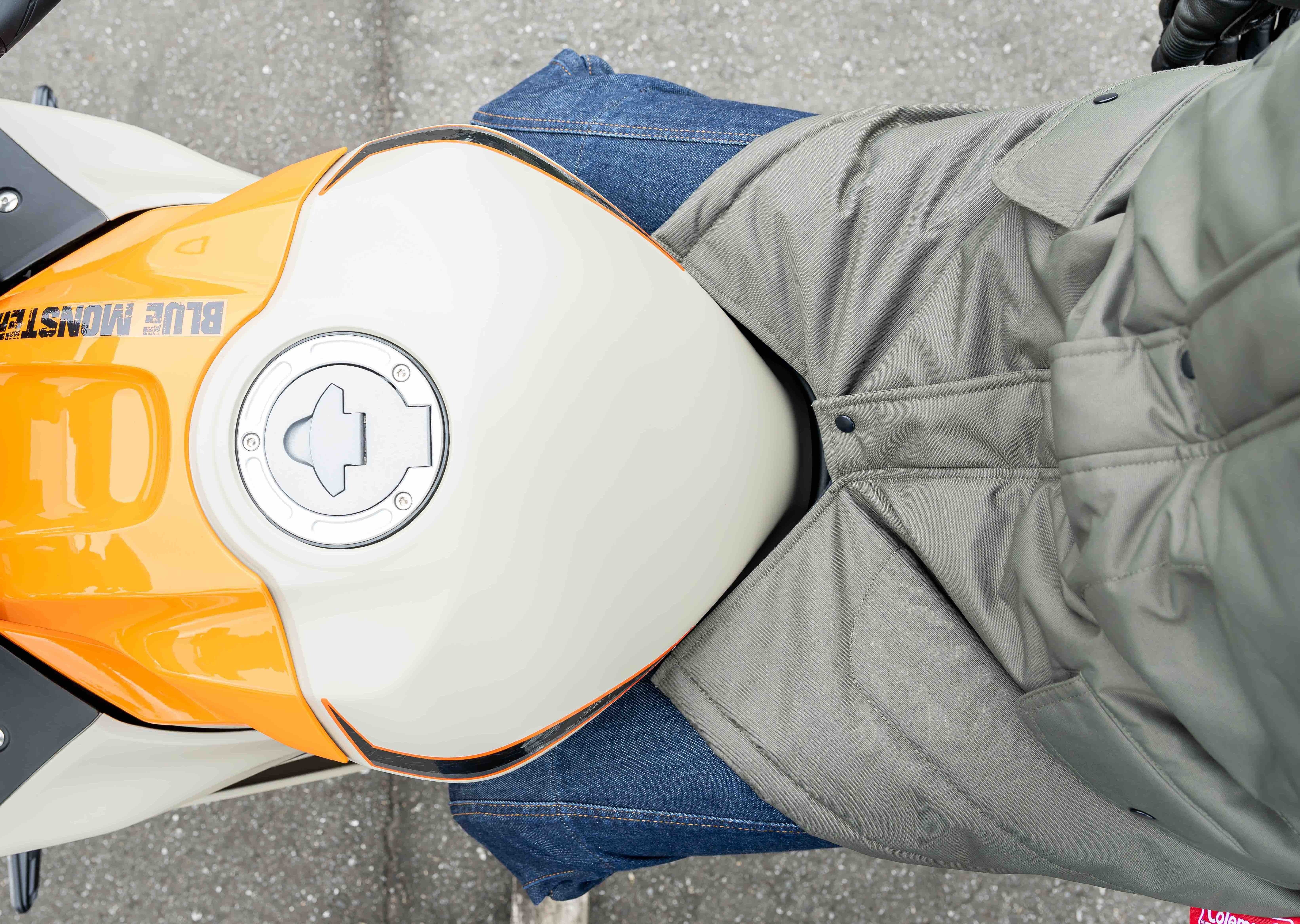 はい!タンクにも触れません!割れ裾だからです!カジュアルのミドル丈アウターだと乗車すると裾で脚は開かないわ(汗)タンクに裾が引っ掛かるわ(汗)邪魔で邪魔で仕方ないですよね!