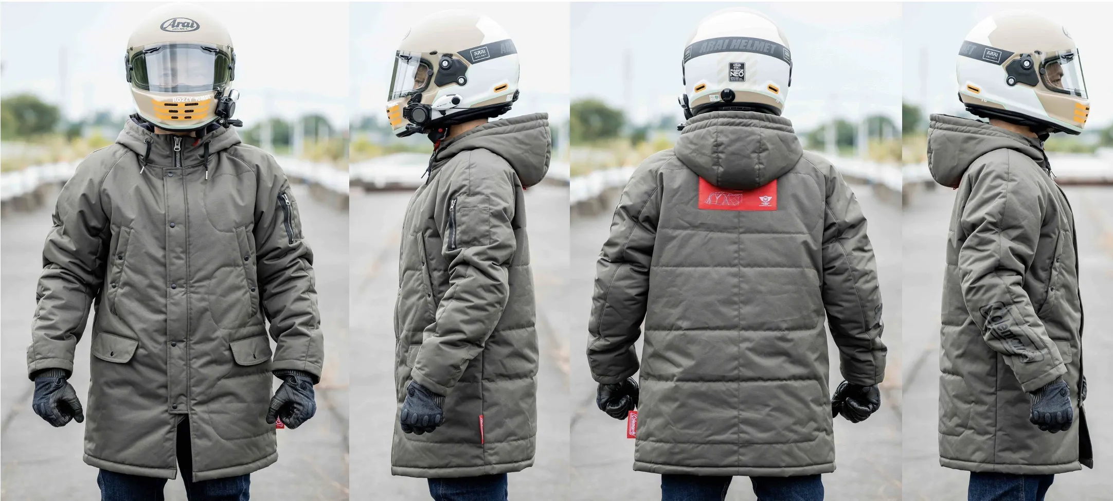 休日にサッと羽織って、ファッションを楽しみ事ができるミドル丈のアウター(フルプロテクター装着)です。ある程度広範囲でボトムス・シューズと違和感なくコーデが組める便利なアウターです。