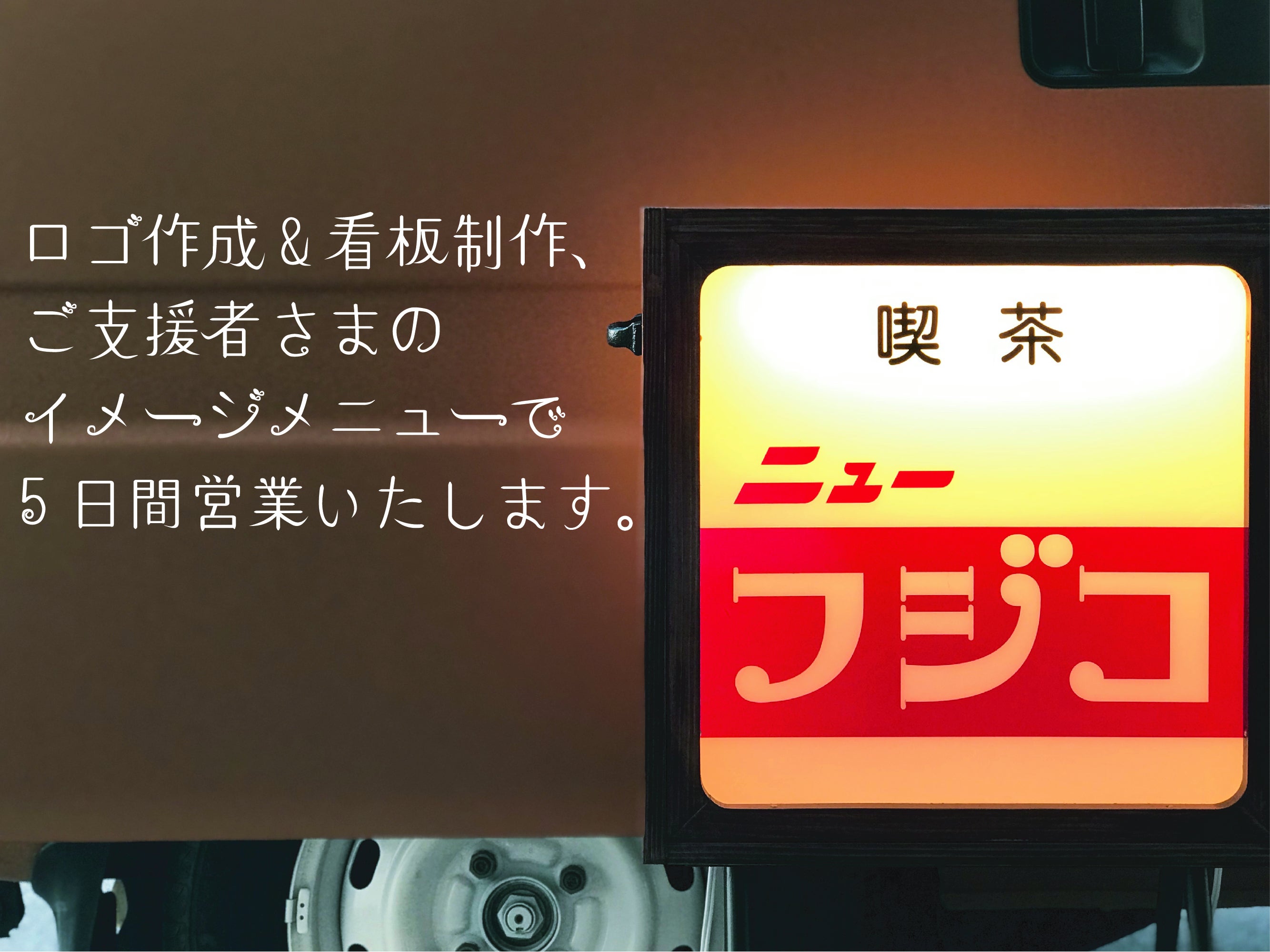 喫茶ニューフジコをご存知の方は見たことがある、あの木製行灯看板をオリジナルロゴで製作し、ご支援者様のイメージでメニュー開発したコラボ喫茶を5日間オープンいたします!