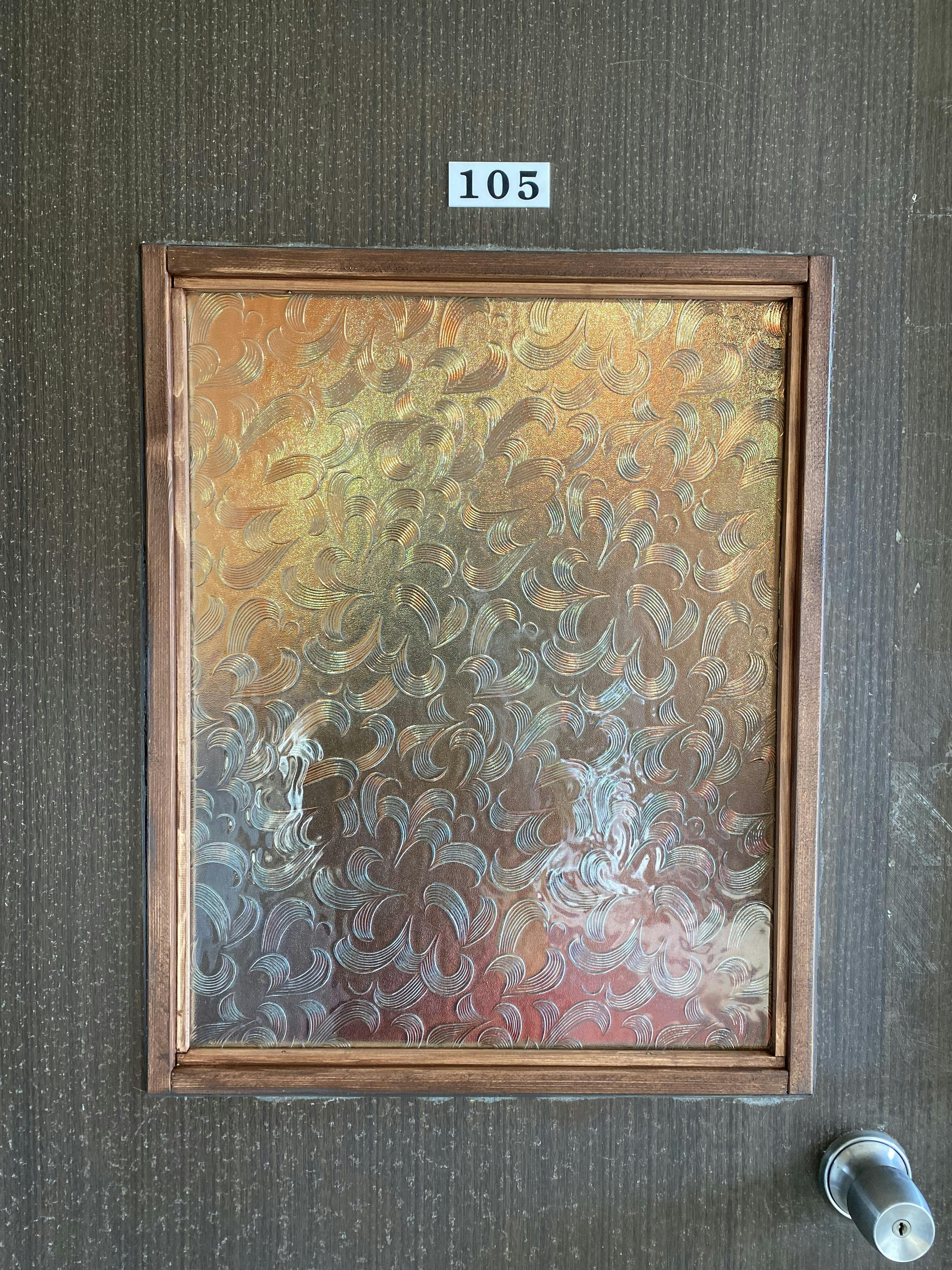 入り口ドアも予算内で収まるよう、ステンドグラスではなく昭和型板ガラスをはめ込みました。