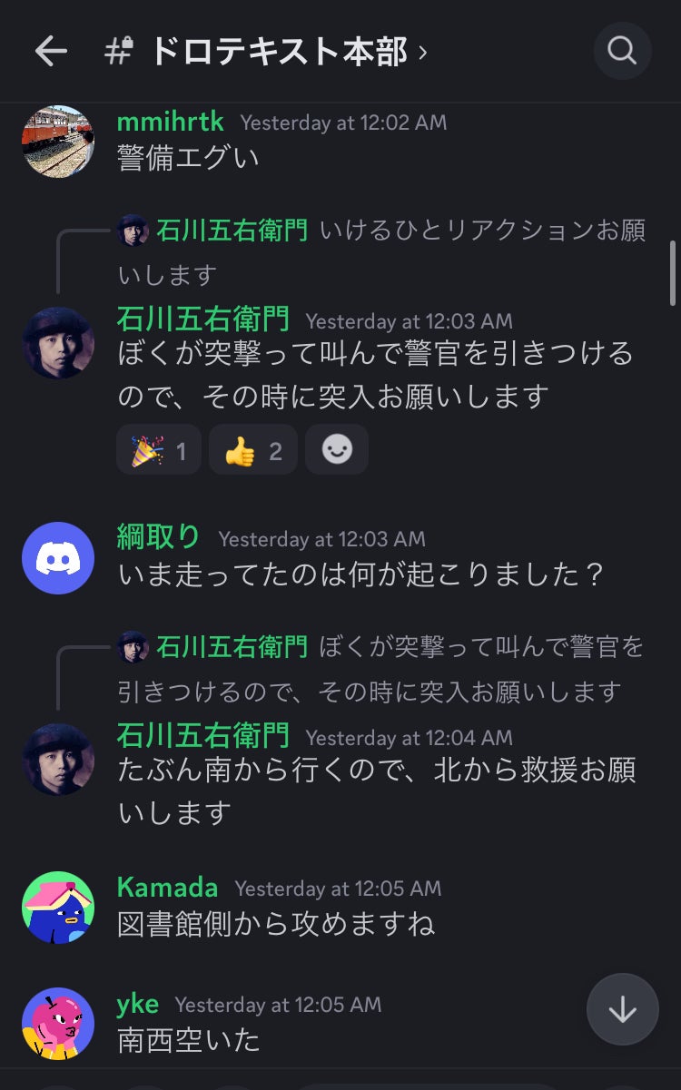 深夜23時というのに、呆れた人数である。どうも大学生というのは暇な生きものらしい。聞いてみると、寮外のひとの割合もけっこう高かった。 ケイドロのルールは簡単だ。警察と泥棒とに分かれて、鬼ごっこをする。泥棒は捕まったら牢屋に入るが、味方がくれば助かることができる。ぼくは警察なんてまっぴらなので、泥棒サイドについた。 1試合目はひたすら隠れていた。終了間際に仲間の救出に向かうも、挟み撃ちにあってあえなく捕縛されるところとなった。 さっきの反省を踏まえて、2試合目は戦略を練ることにした。Discordで連絡を取りあって、みんなに呼びかけてみる。