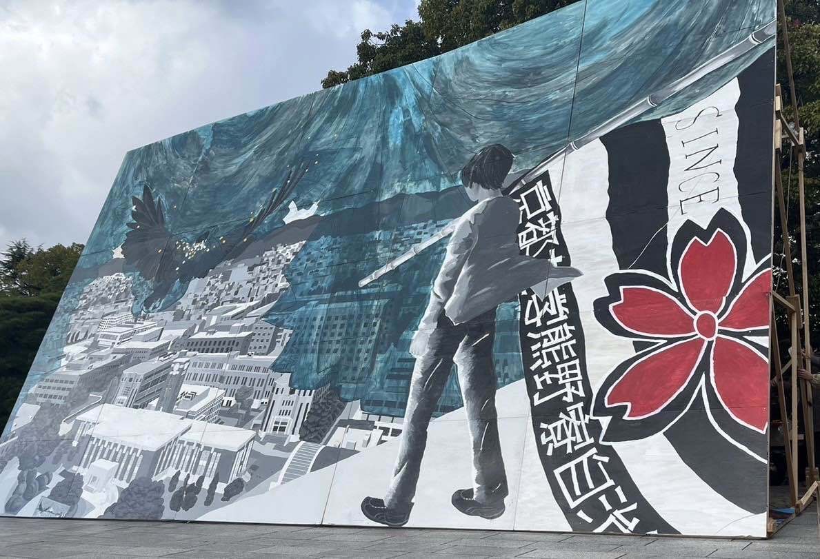 今回の寮祭でタテカン責を務めさせていただきました、せいりゅーと申す者です。二度目(タテカン責としてなら三度目)の活動報告を書かせていただきます。 寮祭も半分を過ぎ、終わりが近づいてきました。ここで、寮祭初日の時計台コンパ、とりわけメインである巨大タテカンについて振り返りたいと思います。当日の深夜、ベニヤ板や支えを京大クスノキ前に運ぶときには心躍りました。今から寮祭が始まる、そしてこの巨大タテカンが立つ時が来るという実感が湧いてきました。 ワクワク! クスノキ前に着いたら、ベニヤ板と支えのパーツを並べて次々と組み立てていきました。巨大タテカンを立てる準備が終わりに近づいていくにしたがって、本当にこんなにでかいタテカンを立てることができるのかという不安も大きくなっていきました。立てようとしてベニヤ板やパーツが割れたり折れたりすれば、時間的に修復は困難、たとえできたとしてももう立てることは絶望的になってしまいます。そんな心境でいると、ついに巨大タテカンを立てるときがやってきました。 せーのっ! 私の掛け声で皆が一斉にタテカンを持ち上げます。今のところ歪みもなく、うまくいきそうに思えました。タテカンの角度がこちら側に倒れる角度を越えて向こう側にゆっくりと倒れていきます。途中バキバキという音が夜の京大構内に鳴り響きましたが、支えはタテカンの重さに耐えることができ、無事大地に降り立ちました。巨大タテカンが立った瞬間は今でも鮮明に覚えています。30枚カンという大きさだからこそ、そしてモノクロだからこそ出る圧倒的な迫力がありました。時計台コンパが終わった後、寮内外問わずタテカンを称賛する声がたくさん耳に入ってきて大変うれしく思っております。タテカンを作ってよかったと心から思えます。 やったー! ここで、巨大タテカンのこだわりポイントを紹介します。手がけたのは私せいりゅーではなく、もう一人のタテカン責である蛍光灯です。一つ目は、時計台です。時計台の文字盤をよく見てみると、ちゃんとローマ数字が書かれています。そして、時計の針がさす時刻は12時15分。これが何を示しているか分かるでしょうか。正解は時計台コンパが始まる時間です。時計台コンパが始まったあの日、この巨大タテカンは現実と一体になったのです。二つ目は、時計台コンパのときにライブペインティングで描いた巨大タテカンです。巨大タテカンの中の巨大タテカン。まるでマトリョーシカですね。ちゃんとデザインも細かく再現しています。巨大なのにこんなに小さいところまでこだわるのか、と驚かれる人もたくさんいらっしゃるでしょうが、これらは私たちタテカン責が現実の完全再現を目指した成果なのです。まだまだアピールポイントはたくさんありますが、文字にしているときりがないのであとは皆さんで見つけてほしいです。巨大タテカンの画像を拡大して隅々まで鑑賞してください。感嘆の声を上げること間違いなしです。 すっごーい! 最後に、あれだけ大きなタテカンを立てることができたのは、私たちタテカン責だけの力ではありません。タテカンを作る手伝いをしに来てくれた寮生たち、タテカンを立てるアドバイスをくださった上回生の方々、そして私たちを応援してくださった寮外生の方々。皆様のお力添えがあったおかげで、私たちタテカン責の使命が成し遂げられたのです。タテカン制作に携わってくれた方々、そしてタテカンを見てくださった方々へ。改めまして、本当にありがとうございました。 タテカンよ、永遠に!