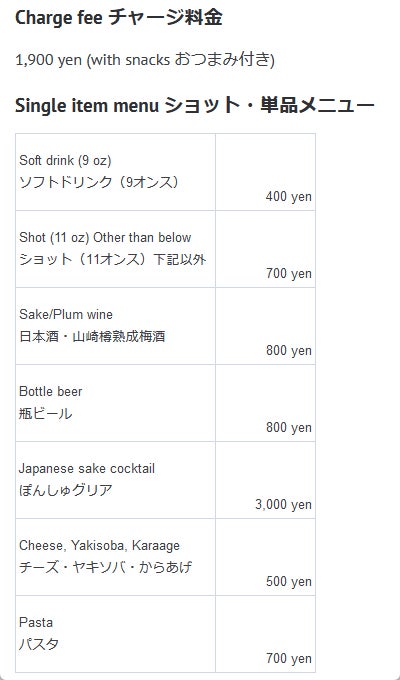 チャージ料金&キープボトル1本ご提供チケット(もしくはソフトドリンク飲み放題、当店バーはお酒が飲めない方も歓迎です)