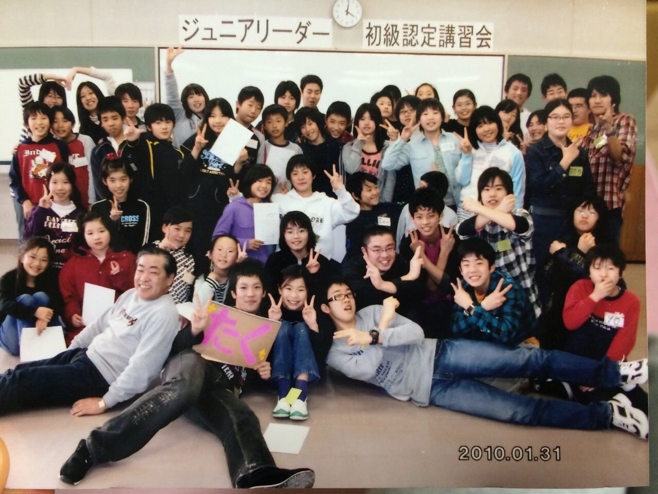 30人くらいの講習会参加者と、それを支える中高大学生のスタッフたちの集合写真。