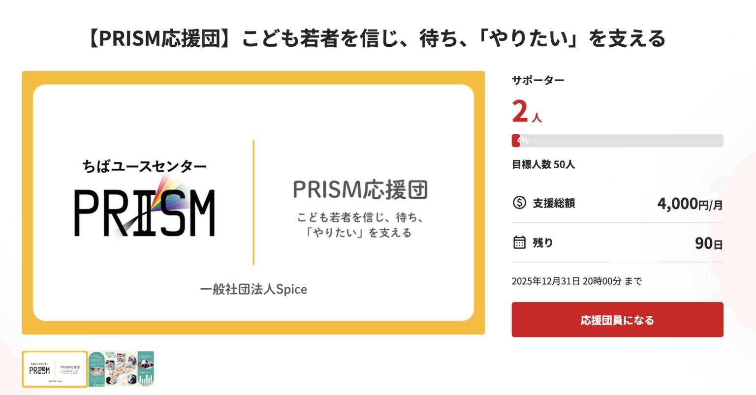今回、1周年を迎えたのち、新しい挑戦として「PRISMの応援団」と名前を決め、マンスリーでご支援いただく方を募っています!地域のぜひ私たちと一緒に未来を担うこども若者支援を月額で支えてくださる方、ぜひご寄付で応援していただけると嬉しいです。