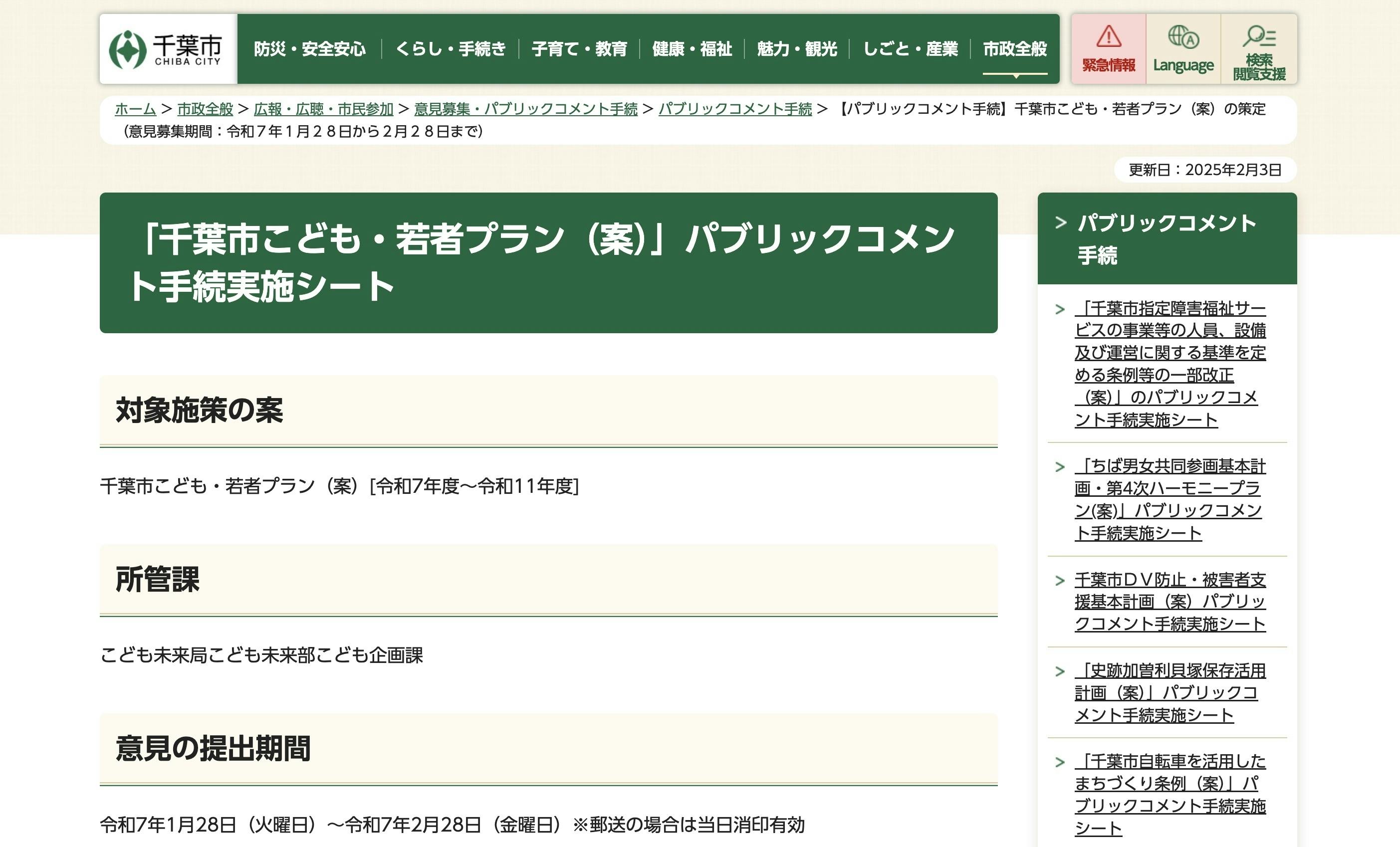 PRISMに来る若者たちの中には「政治について知りたいけれど学校で話すと意識高い系と言われてしまう・・・」とか「もっとまちづくりについて、真剣に語ってみたい」と言った声を聞きます。こんな声からはじまったのが、「コーヒーハウス」という企画です。若者たちが集まり、政治やまちづくりについて、コーヒーを飲みながらゆったり考える企画を不定期で開催をしています。(コーヒーが飲めない人用に紅茶やジュースなども用意してます ! 笑)コーヒーハウス当日の様子今回の活動報告は、こども若者たちが暮らすまちづくりに関わるお話です。現在、「千葉市こども・若者プラン(案)」のパブリックコメントが募集されています。 2月28日まで の締め切りです。この計画は、こども・若者の未来を左右する重要なもの。「こういうサポートが必要!」「こんな未来であってほしい!」「この点がもっと良くなるといいのでは?」などなど、そんな意見を、ぜひパブリックコメントを通じて届けてください。▶︎千葉市こども・若者プランhttps://www.city.chiba.jp/kodomomirai/kodomomirai/kikaku/r6_kodomowakamonoplan_public_comment.htmlこのパブコメは誰でも意見を送ることができます。「自分の意見が本当に届くの?」と不安に思う方もいるかもしれません。行政はパブリックコメントを通じて、みなさんの声を受け取り、それをもとに計画を改善する仕組みになっています。こども・若者の未来のために、一緒にアクションを起こしてみましょう!