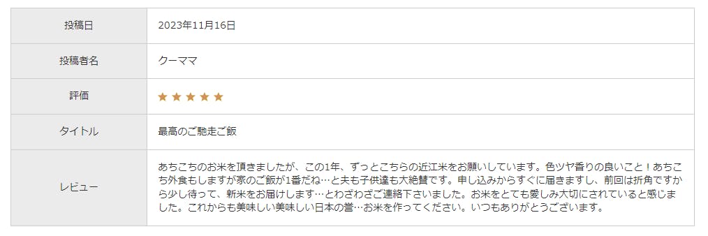 リピーターの皆様からは「他の有名産地のお米を食べていたが、乗り換えました」というお声を多数いただいております。お弁当屋さんや和食店でも高い評価をいただいており、特に兵庫県芦屋市周辺や関西・関東のお客様から多くの支持を得ています。