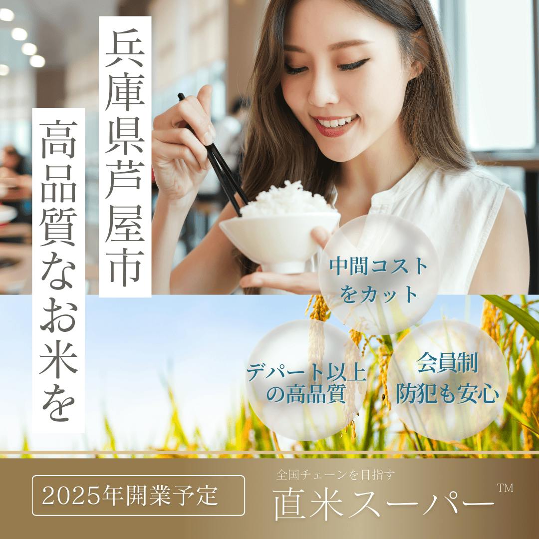 私たちは、兵庫県芦屋市に「直米スーパー(仮称)」第1号店を開業することを目指しています。このお店では、新鮮で高品質なお米を、通販よりも安価に提供できるビジネスモデルを目標としています。